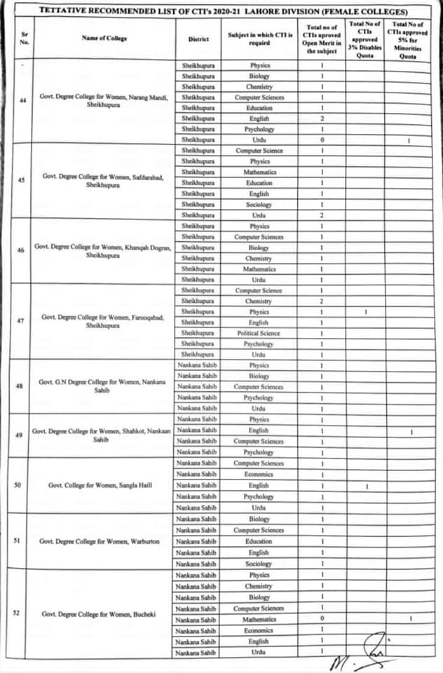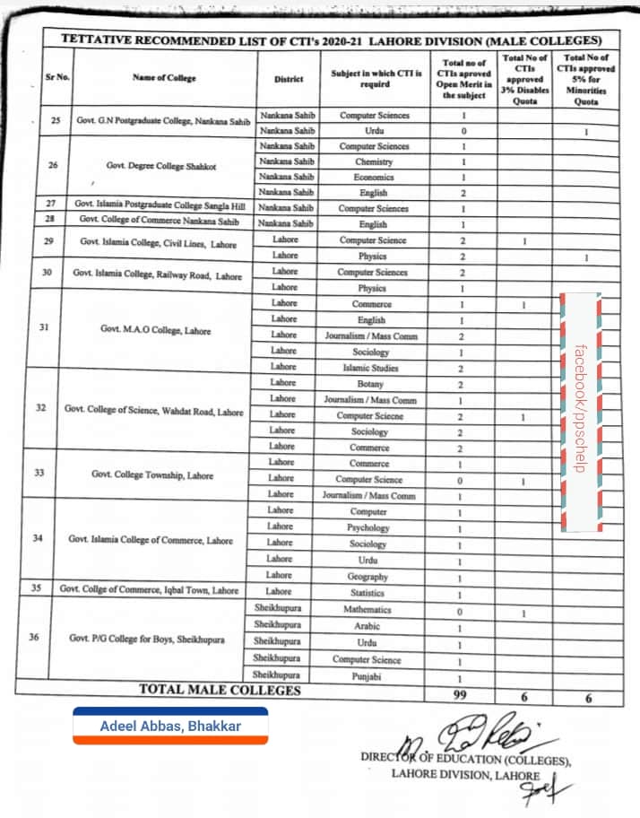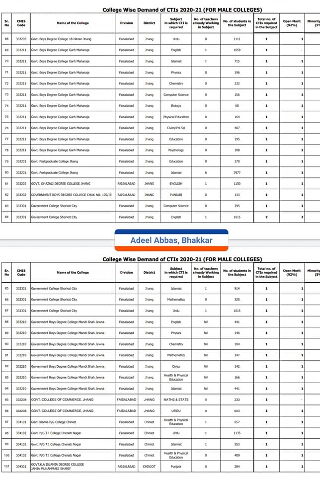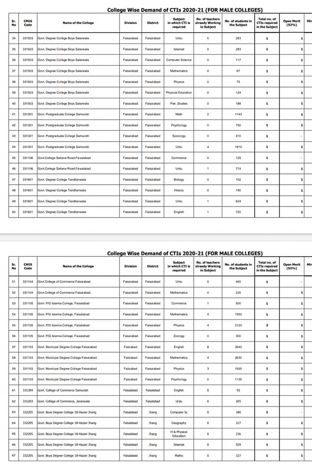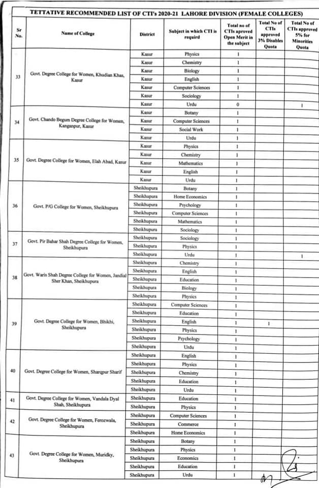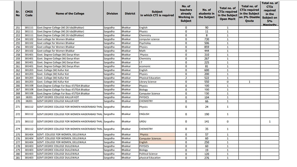 The subject wise details of the vacant posts in the colleges of Lahore, Nankana Sahib, Shekhupura, and Kasur I have received. This vacancy statement is for both male and female colleges of these districts. The willing candidates can apply as per schedule keeping in view the qualification marks criteria of these teachers’ jobs. The list is as under: