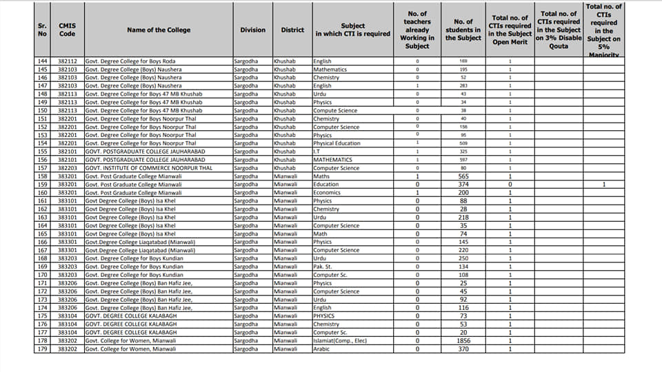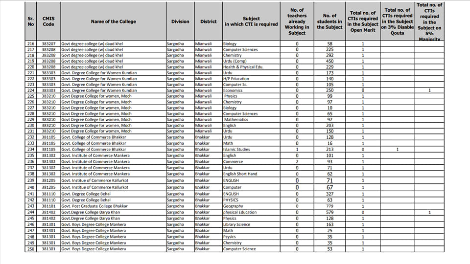 Sargodha Division CTIs Subject Wise Vacancies List