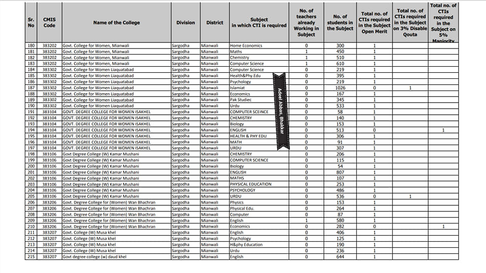 Subject wise vacancies in district khanewal college