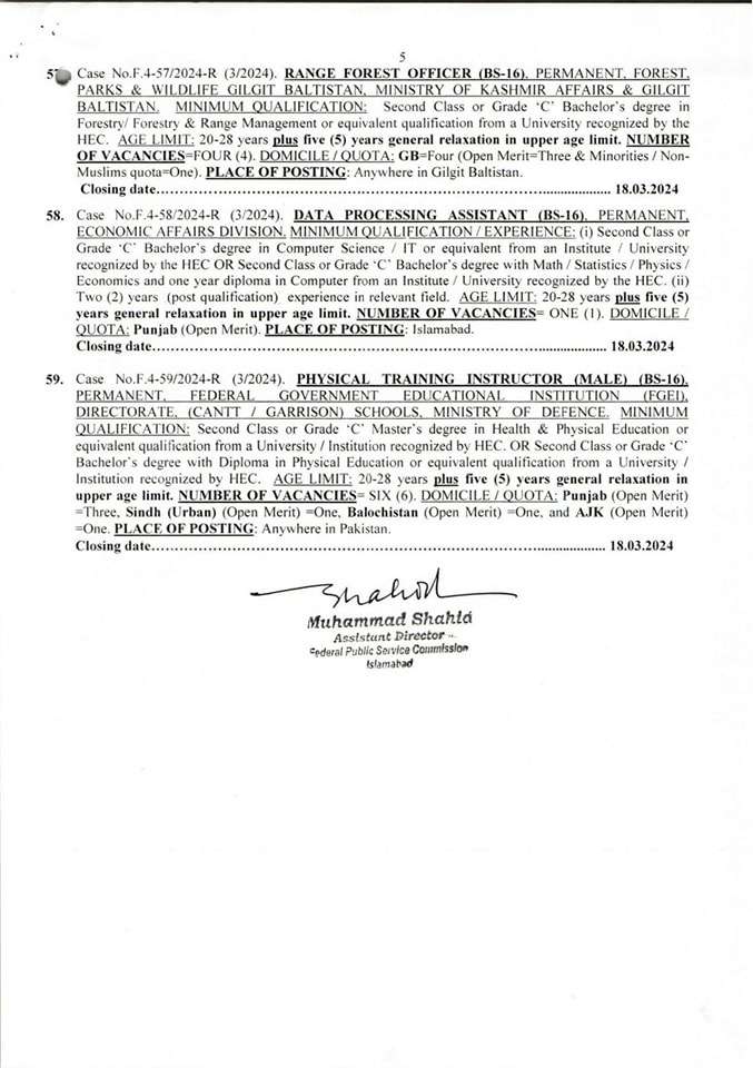 The last date to apply for the FPSC jobs consolidated ad No. 03/2024 is 18 March 2024. The candidates can get the full details of each post as under: