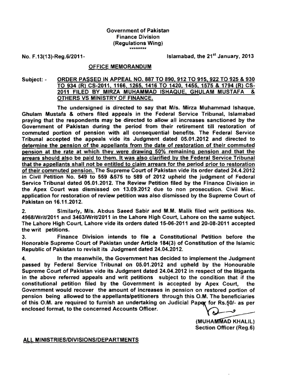 Benefit of all increases (not given on commuted part from 2001 onward) had to be given in pursuance of Federal Service Tribunal orders dated 5.1.2012 upheld by Supreme Court on 24.04.2012.