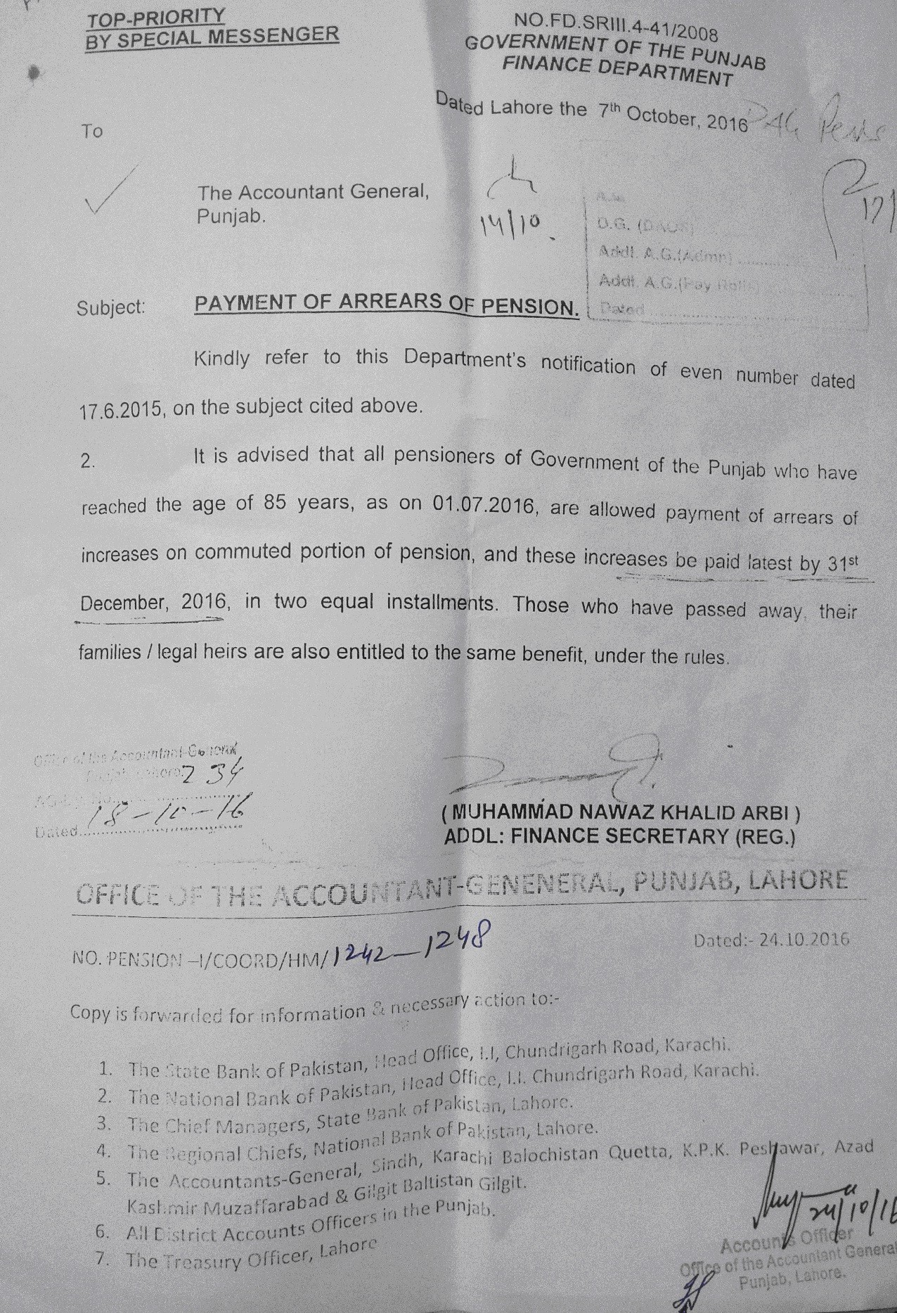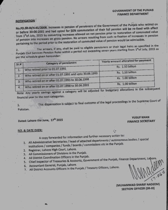 - There is need for immediate orders from Finance Department and AG Punjab to all DAOs that all restorations, occurring 01 July 2015 onward, have to be paid by giving the benefit of all increases notionally on Gross Pension, and paid from current budget allocations from the date of restoration. Special additional allocations relate only to arrears for the period prior to 1 July 2015.
