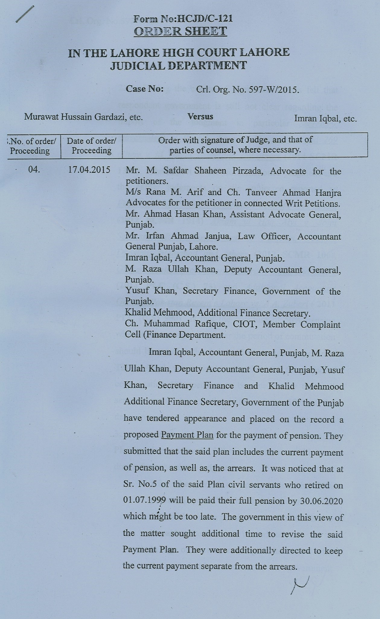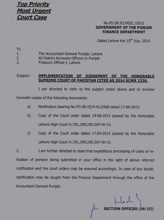 - Instead of issuing clear-cut orders to the above effect, copies of Court orders were simply forwarded by Finance Department to AG Punjab and all District Accounts Officers through FD.SRIII.Misc./2015 dated 15 July 2015. All DAOs were left to conclude for themselves the correct interpretation of court orders.