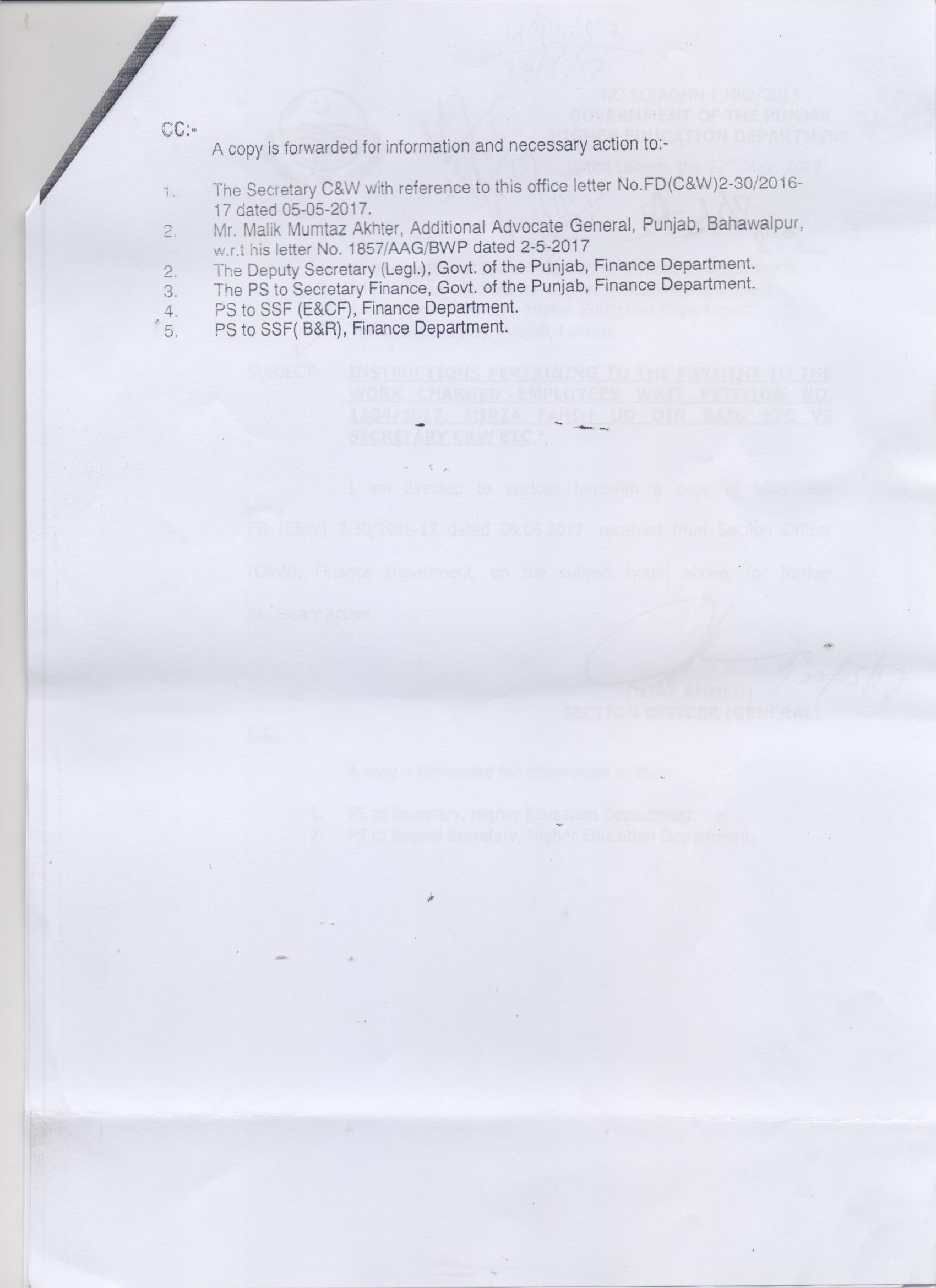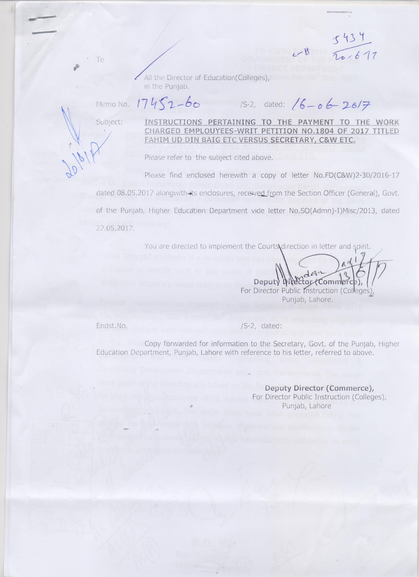 Kindly refer to the subject noted above in the above titled case, the Honourable Mr. Justice Muhammad Ameer Bhatti LHC Bahawalpur Bench, Bahawalpur directed to chalk out mechanism / permanent solution for payment to the Work Charged employees. In this respect, the following intrusions are being issued and be complied with positively: