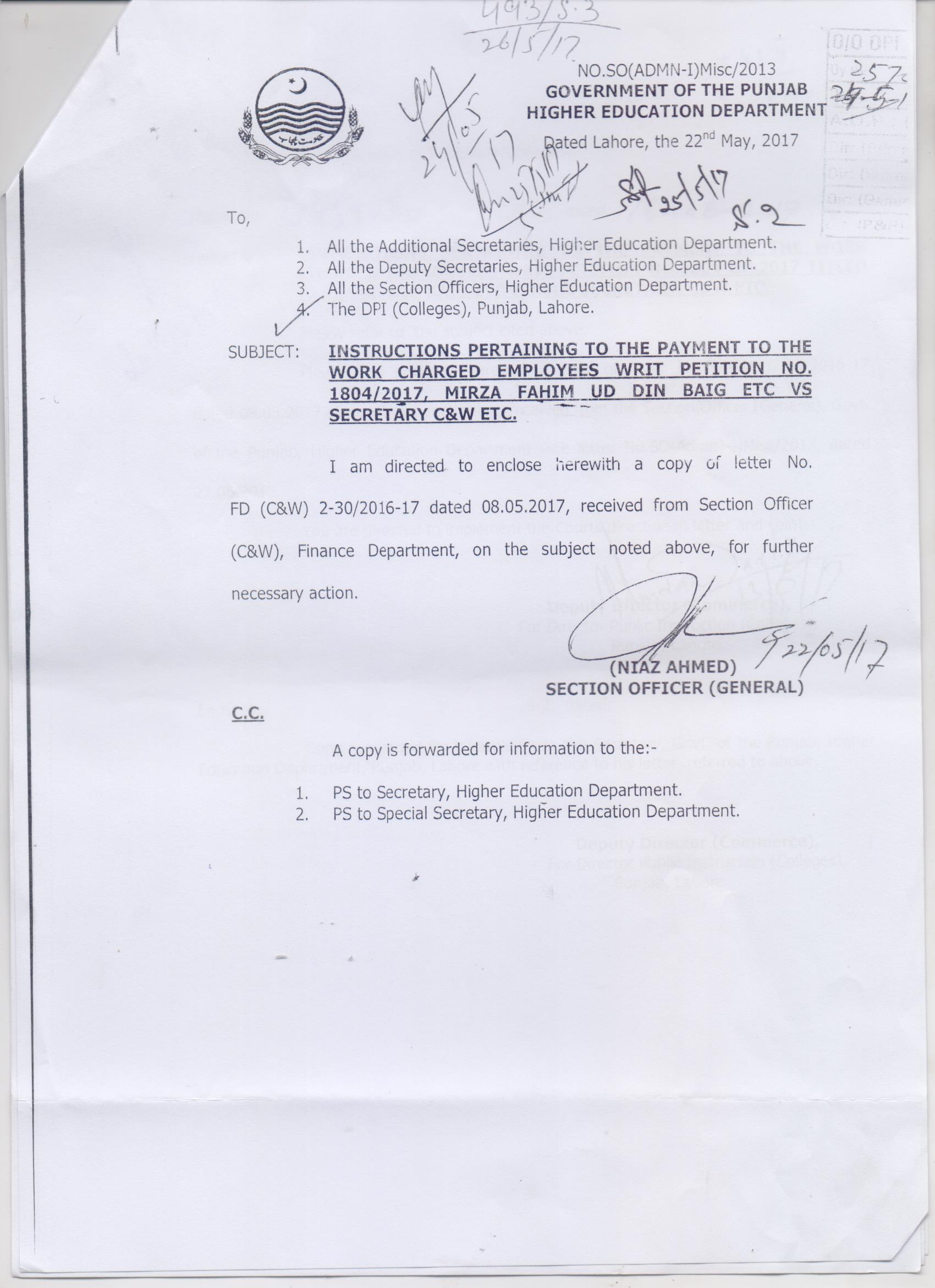 Government of the Punjab, Finance Department has issued Notification on 8-05-2017 in connection with Instructions pertaining to the payment to the Work Charged Employees. Summary is as under: