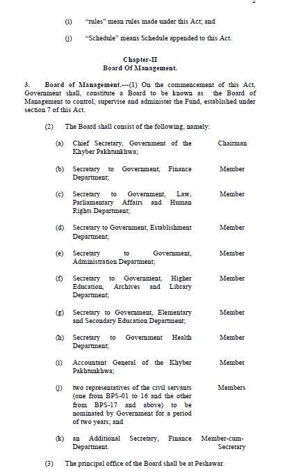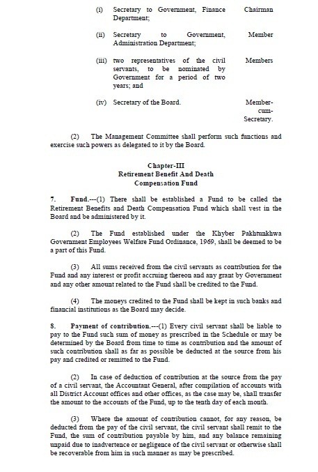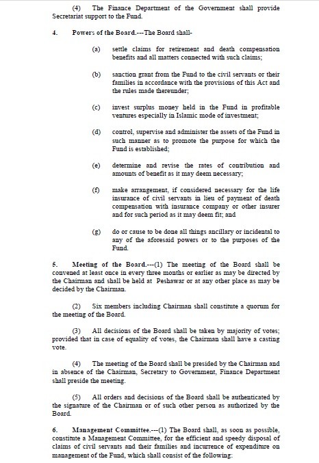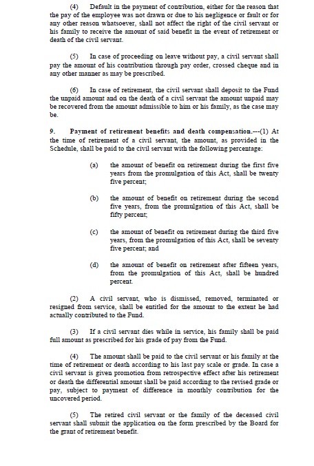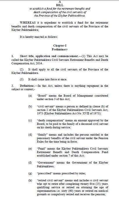 Government of the Khyber Pakhtunkhwa has passed a bill to establish a Fund for the Retirement Benefits and Death Compensation of the Civil servants of the Province of the KPK. This act may also be called as “Khyber Pakhtunkhwa Civil Servants Retirement Benefits and Death Compensation Act, 2014”.