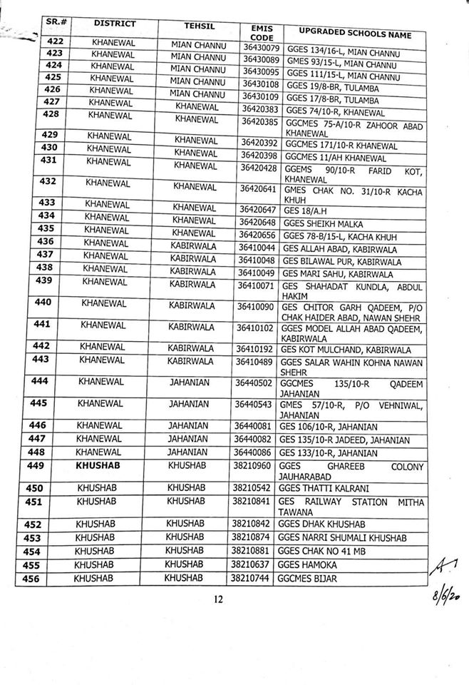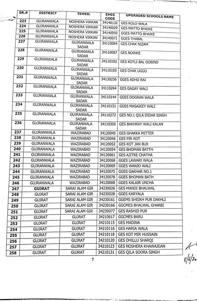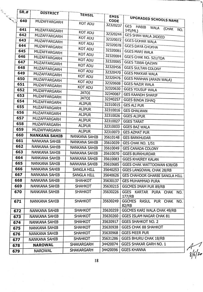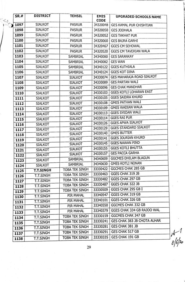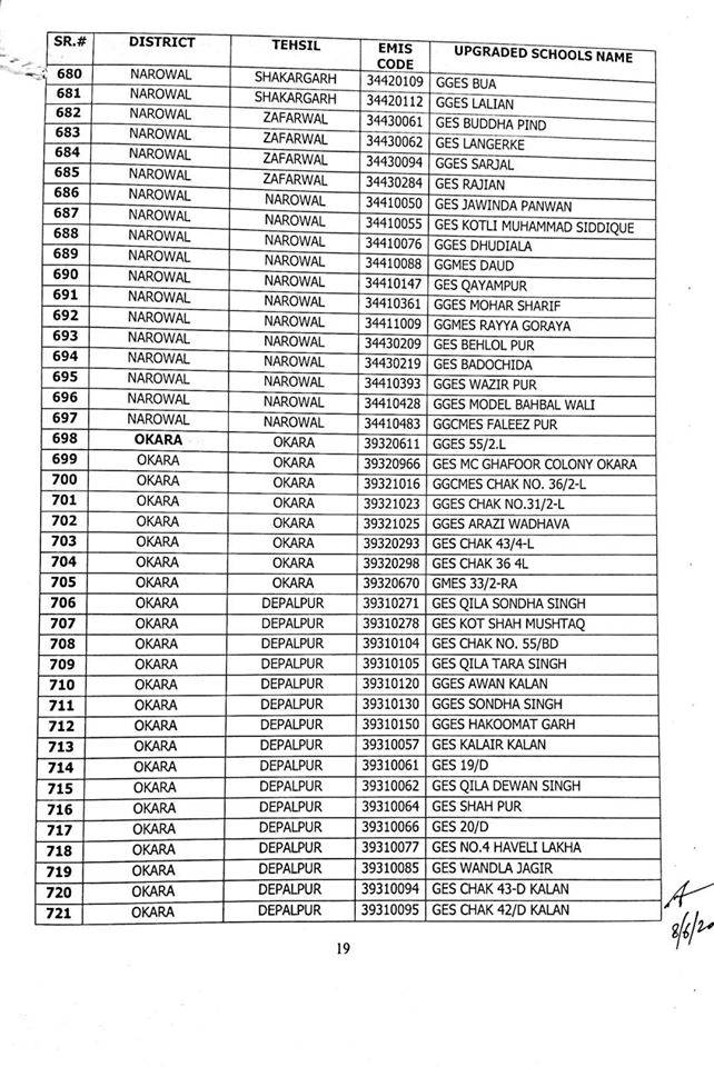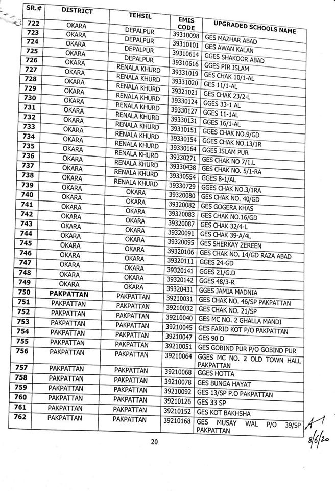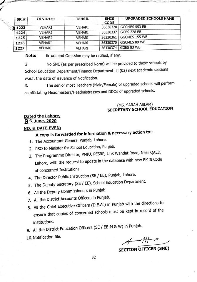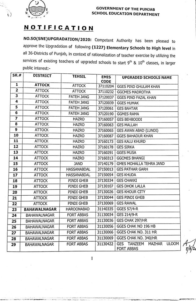 NO.SO(SNE)UPGRDATION/2020: Competent Authority has been pleased to approve the Upgradation of following (1227) Elementary Schools to a high level in all 36-Districts of Punjab, in context of rationalization of teacher exercise by utilizing the services of existing teachers of upgraded schools to start 9th & 10th classes, in the larger public interest:-