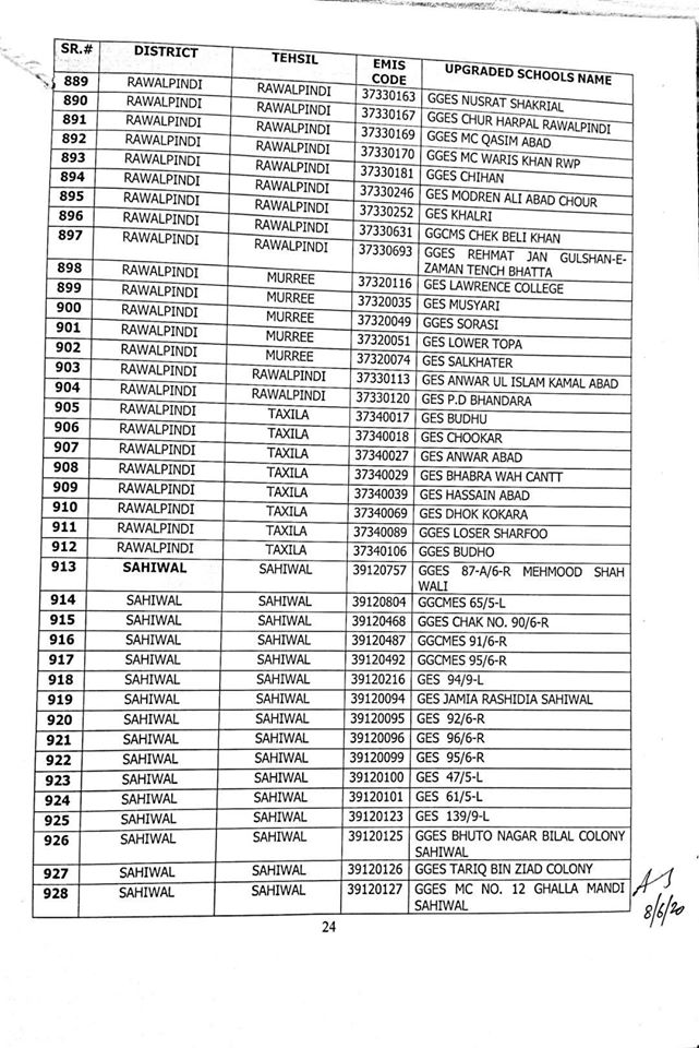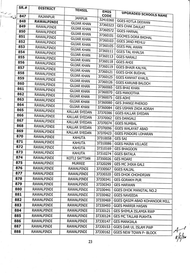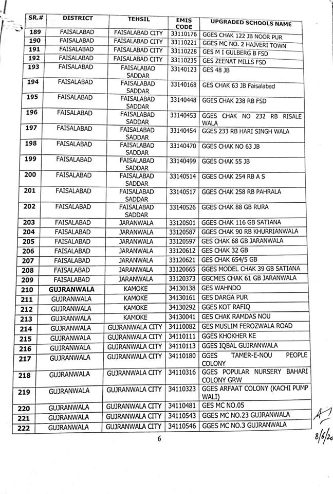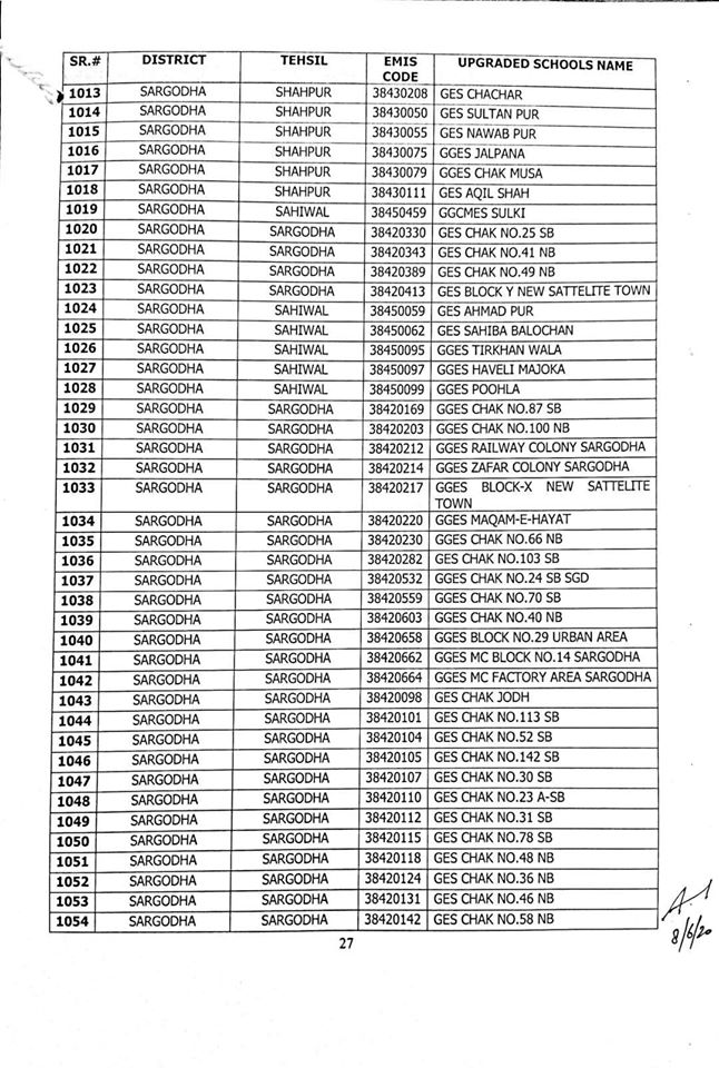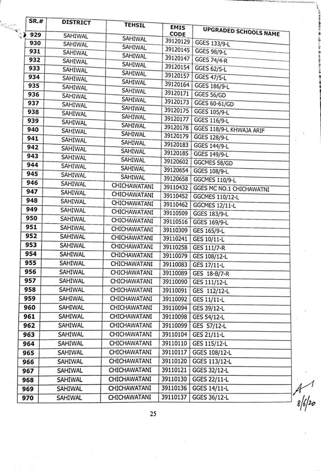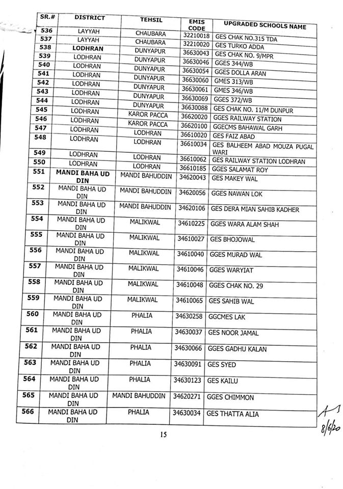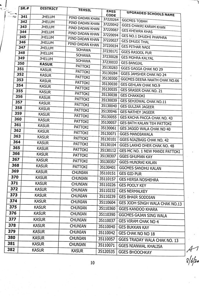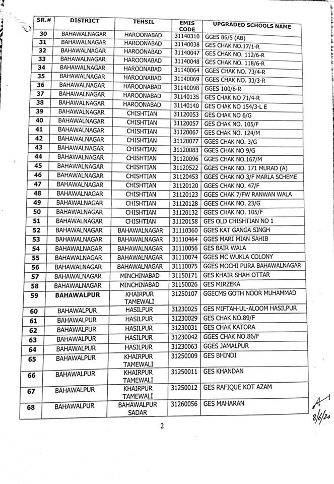NO.SO(SNE)UPGRDATION/2020: Competent Authority has been pleased to approve the Upgradation of following (1227) Elementary Schools to a high level in all 36-Districts of Punjab, in context of rationalization of teacher exercise by utilizing the services of existing teachers of upgraded schools to start 9th & 10th classes, in the larger public interest:-