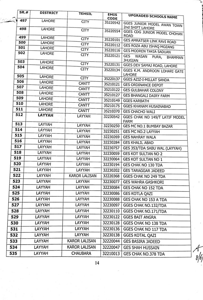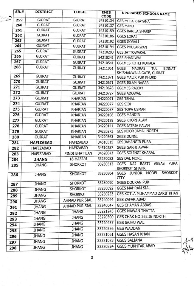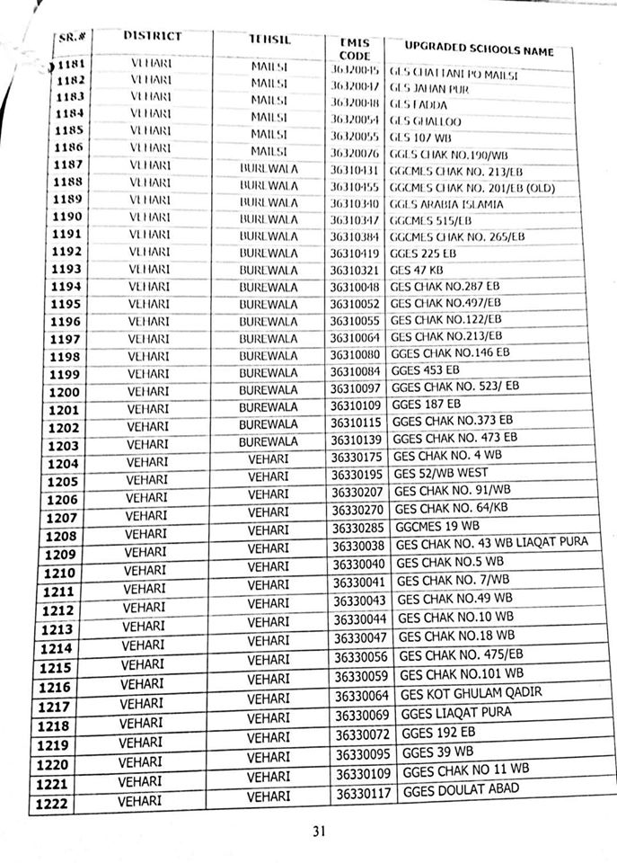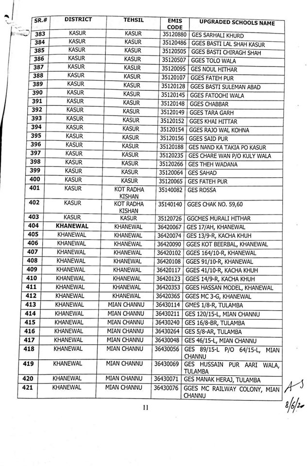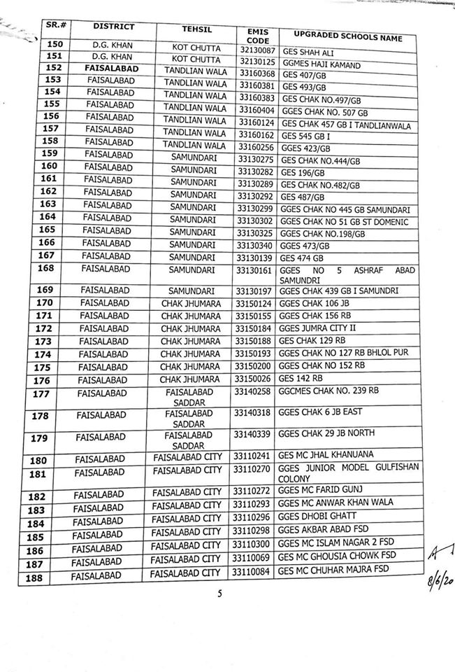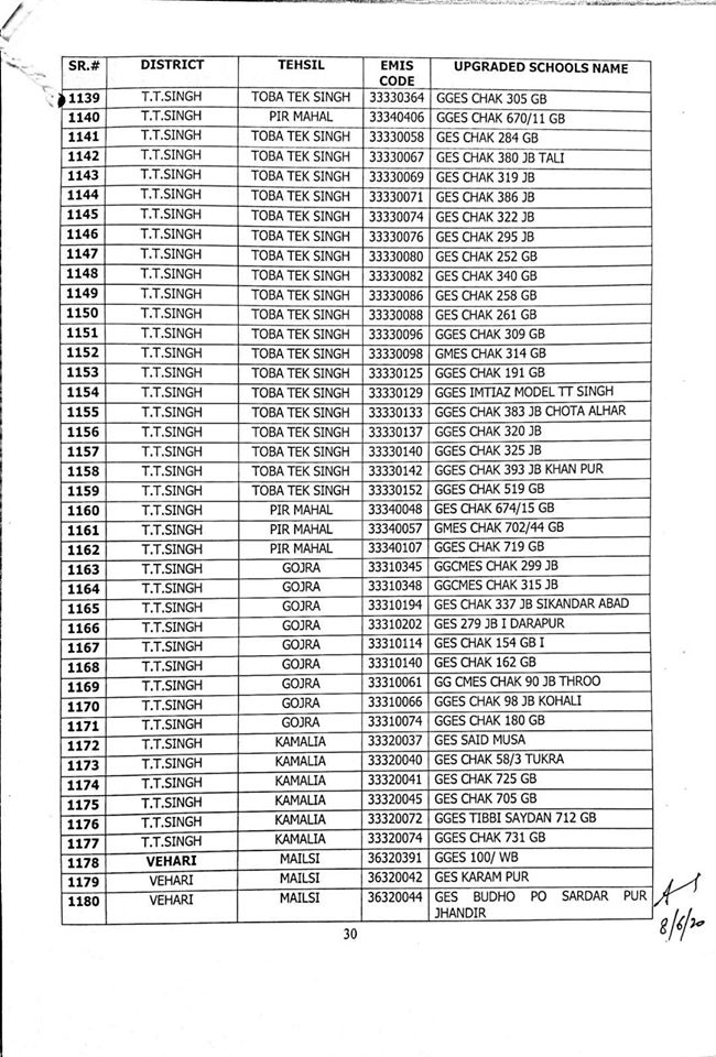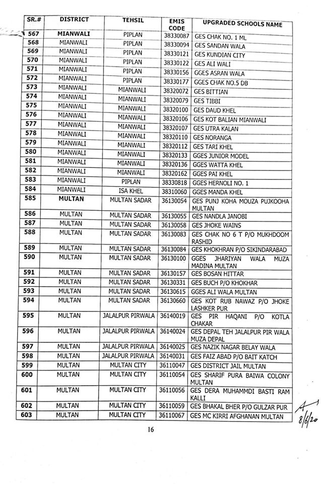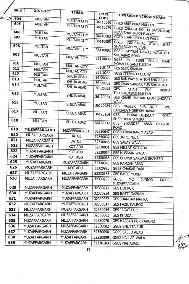 NO.SO(SNE)UPGRDATION/2020: Competent Authority has been pleased to approve the Upgradation of following (1227) Elementary Schools to a high level in all 36-Districts of Punjab, in context of rationalization of teacher exercise by utilizing the services of existing teachers of upgraded schools to start 9th & 10th classes, in the larger public interest:-