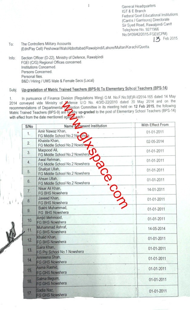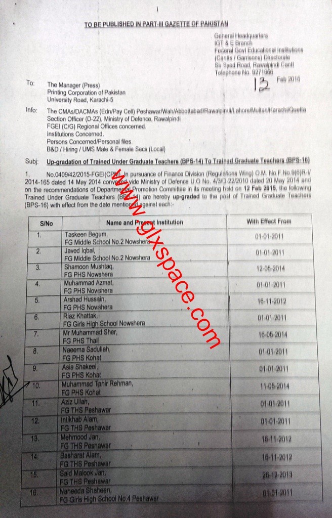 FGEI (C/G) Directorate, GHQ Raqalpindi has issued Notification No. 0409/42/2015-FGEI (CPM) dated 13-02-2015 in connection with List of Leftover Cases of Upgradation of MTTs/TUGTs of FGEI.