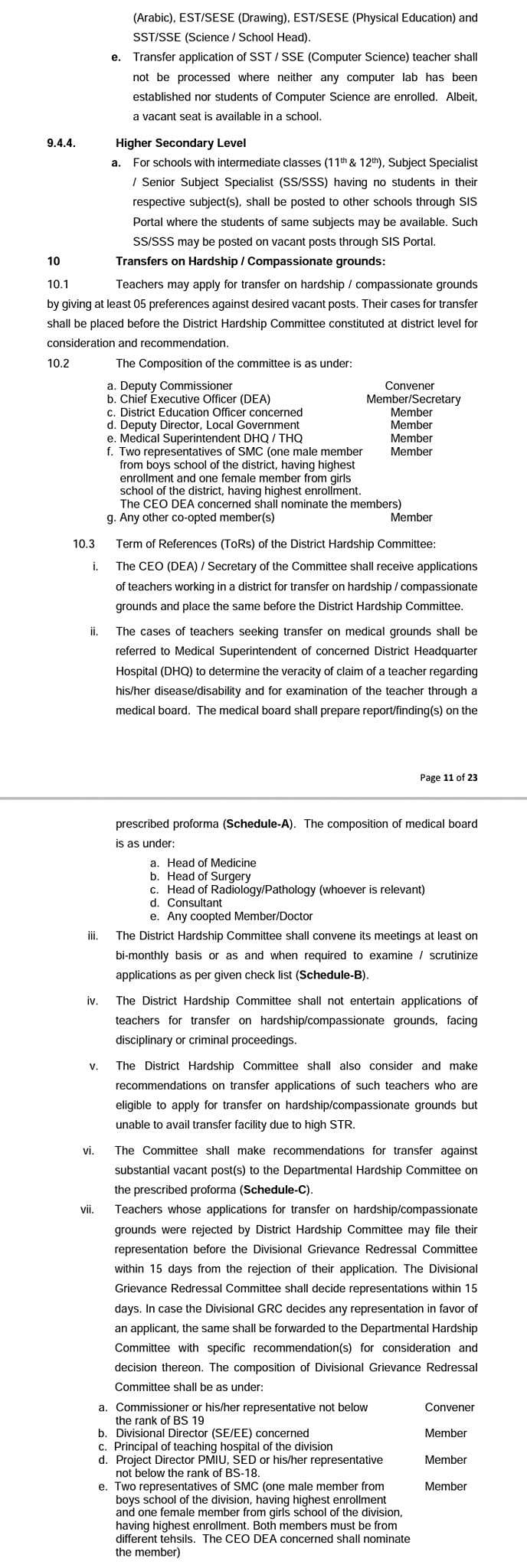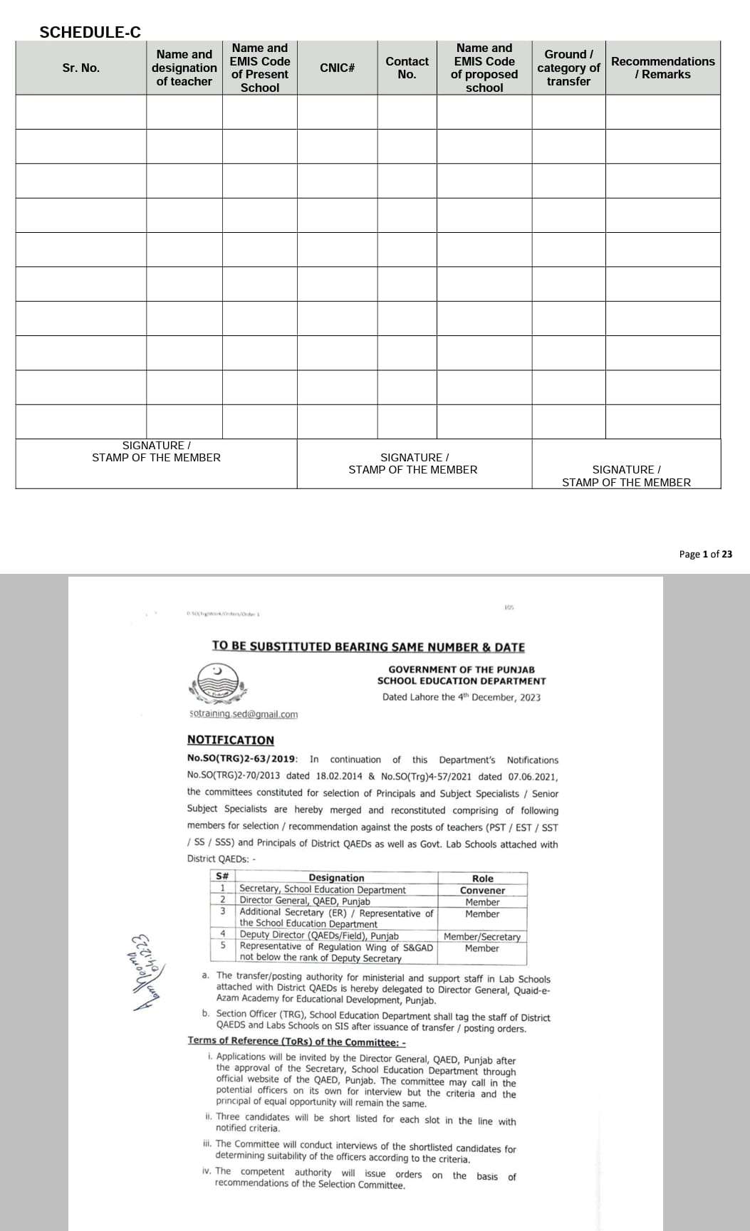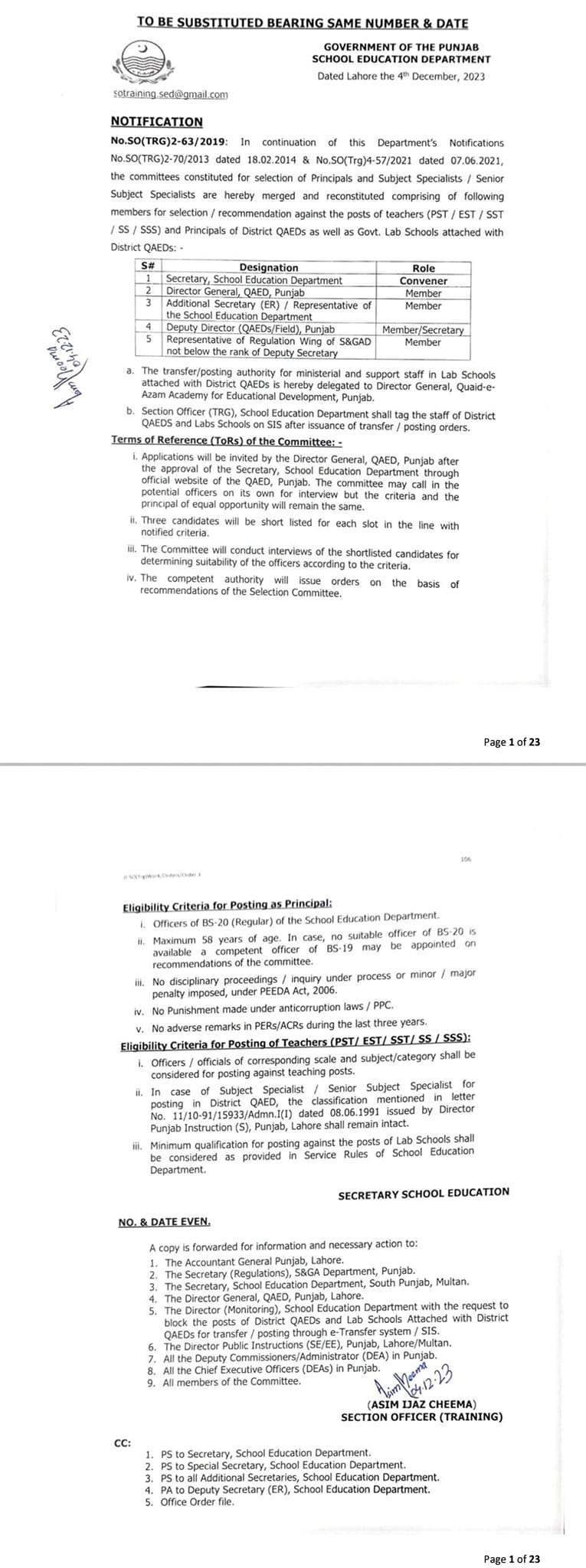 No. SO (TRG)2-63/2019: in continuation of this Departments notification NO.So(TRG)2-70/2013 dated 18-02-2024 & NO.SO(TRG)4-57/2021 dated 07-06-2021. The committees constituted for the selection of Principals and Subject Specialists / Senior Subject Specialists are hereby merged and reconstituted comprising of following members for selection/recommendation against the posts of teacher (PST / EST / SST / SS / SSS) and Principals of Districts QAEDs as well as Govt. Lab Schools attached with District QAEDs:-