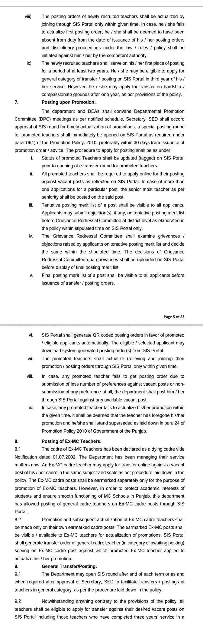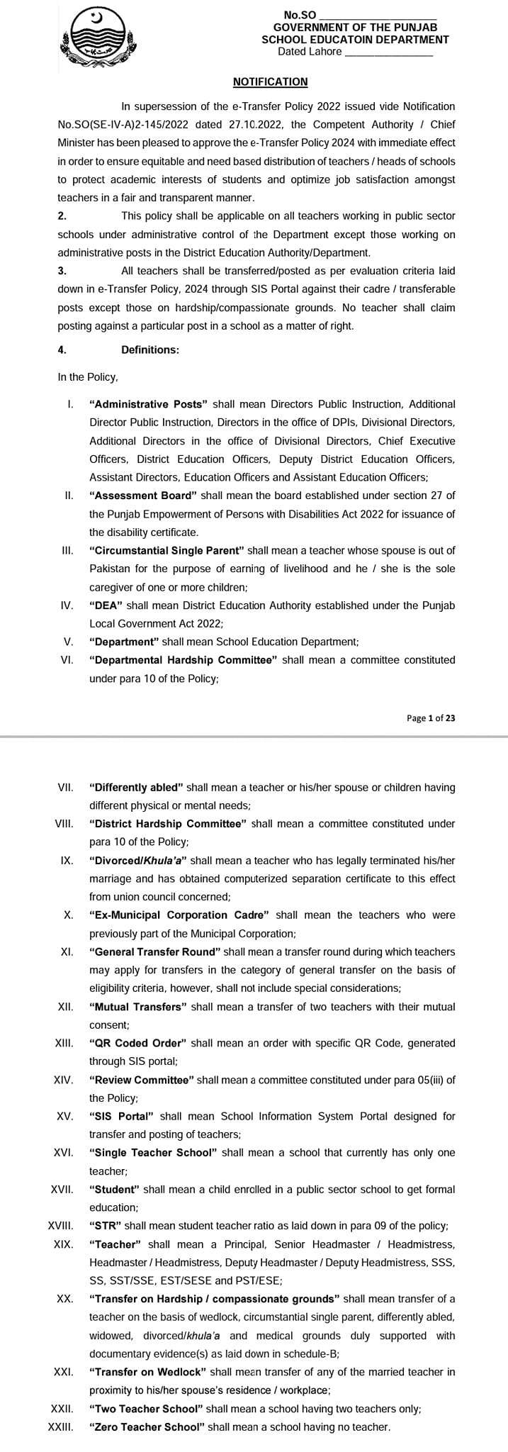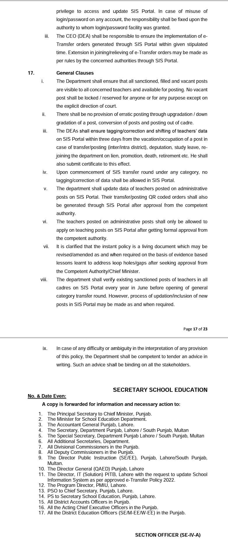 E-Transfer Policy 2024 SED Punjab