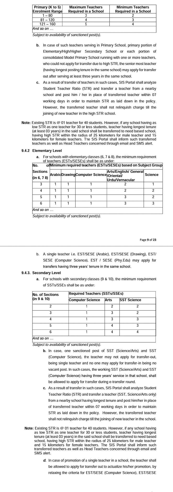 | No of Section in (9 & 10) | Required Teachers (SSTs / SSEs) | |||