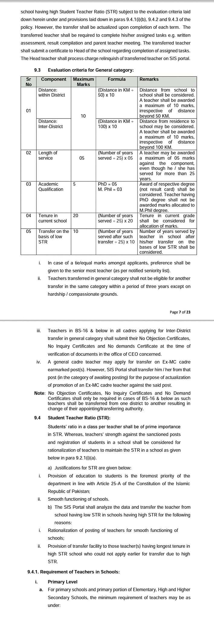 | 5 | Transfer on the basis of low STR | 10 | (Number of ears served after such transfer / 25) x 10 |