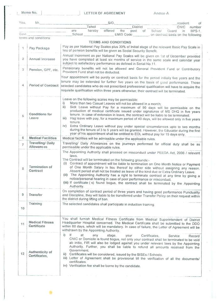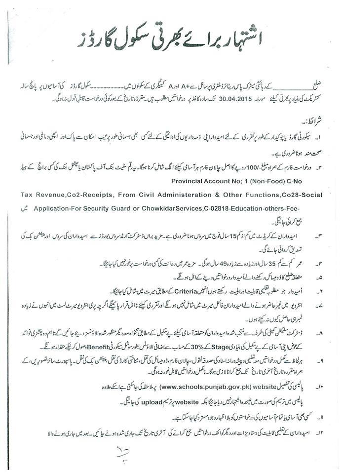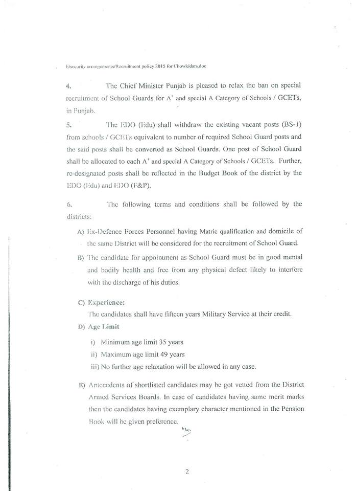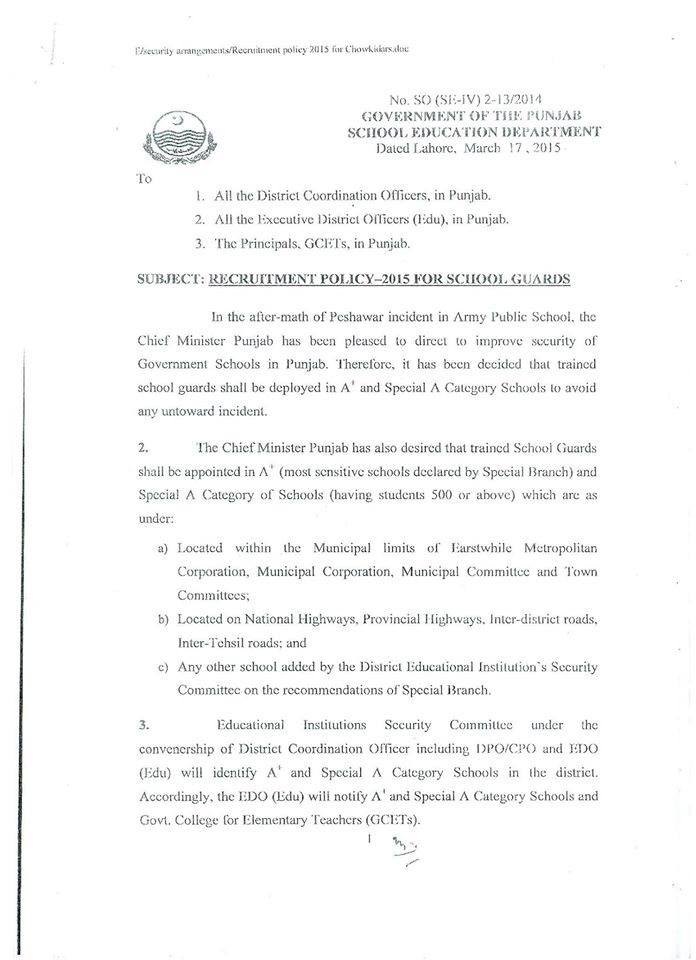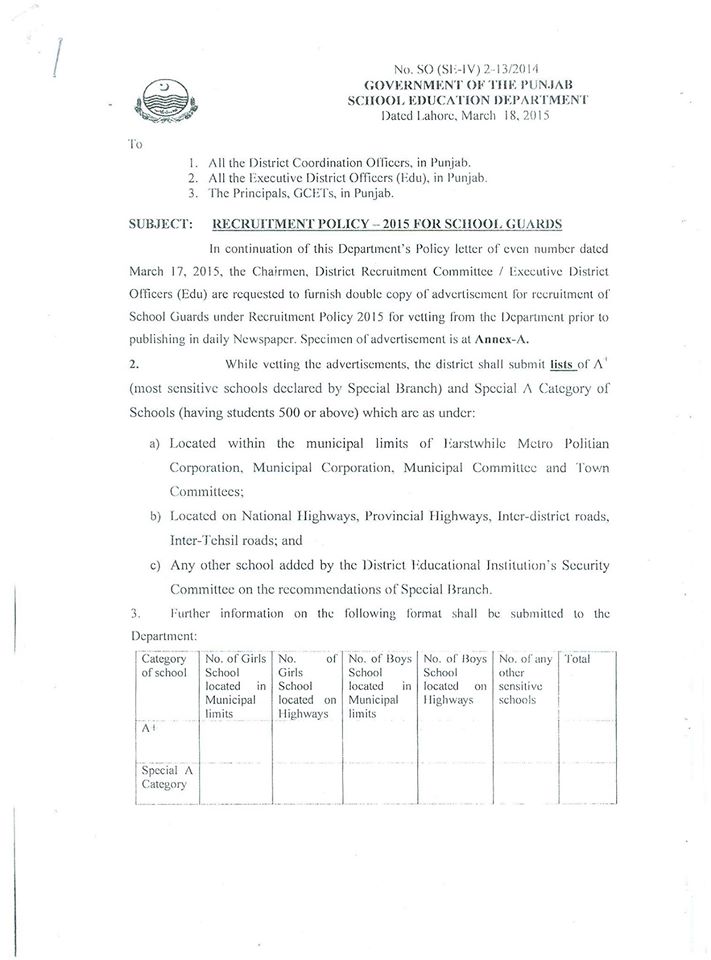In this regard the letter of the dated 17-03-2015 has already been issued. In this letter it is stated that “In the after-math of Peshawar incident in Army Public School, the Chief Minister Punjab has been pleased to direct to improve security of Government Schools in Punjab. Therefore it has been decided that trained School Guards shall be deployed in A and Special Category A Schools to avoid any unwanted incident. Full details of these letters are available at the copies of these letter uploaded.