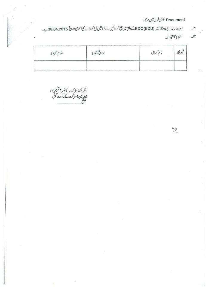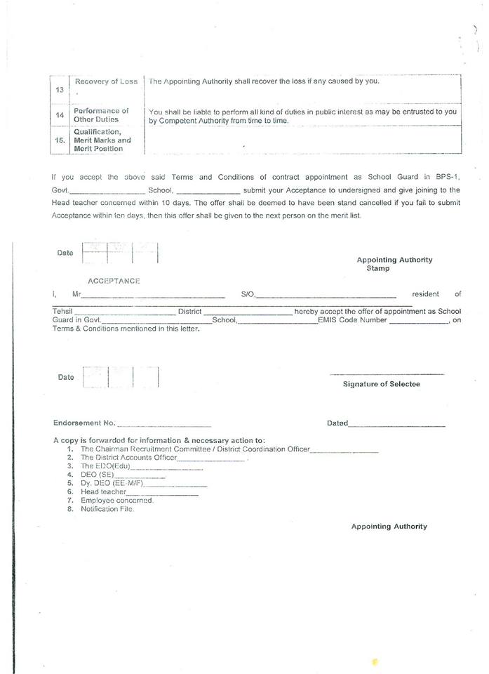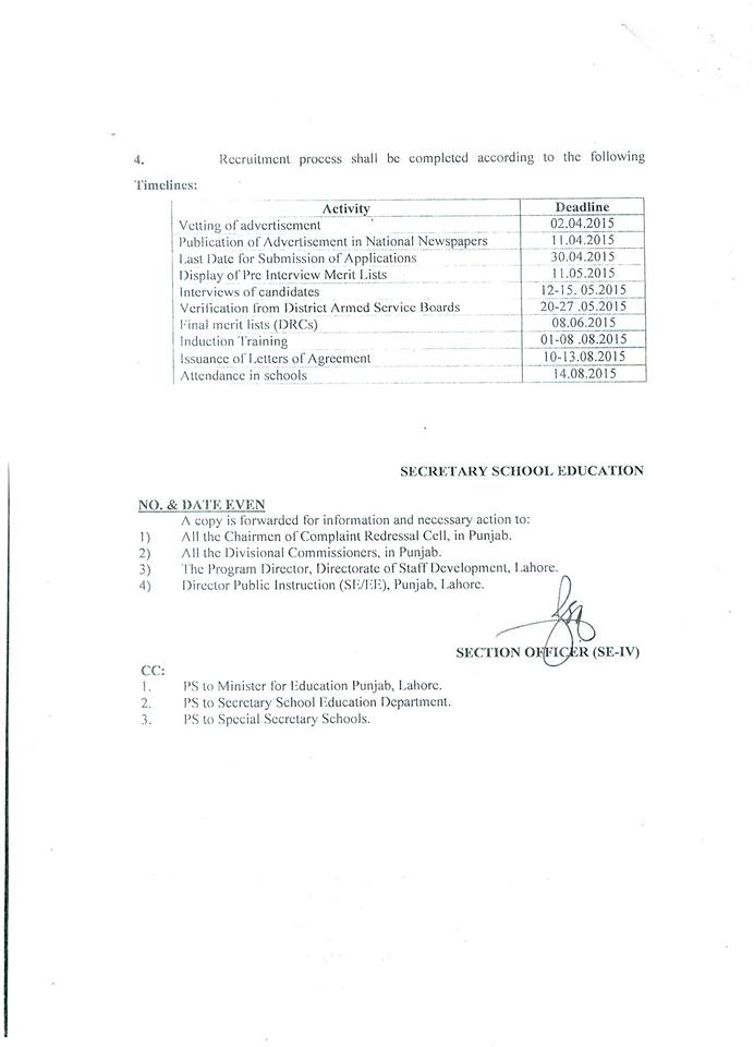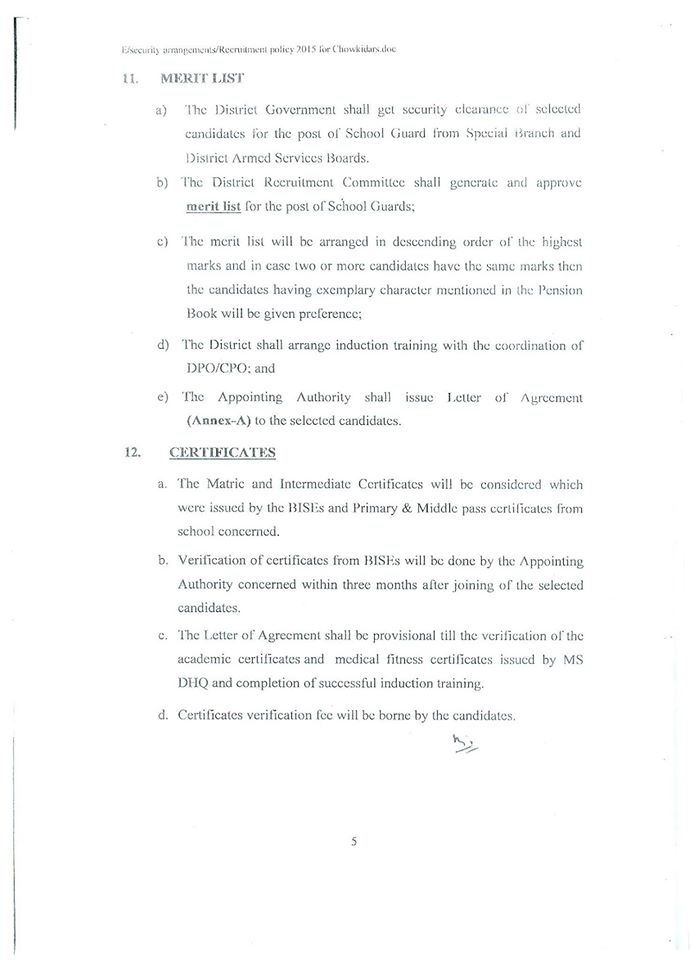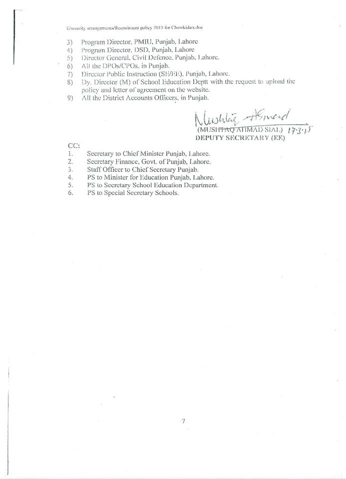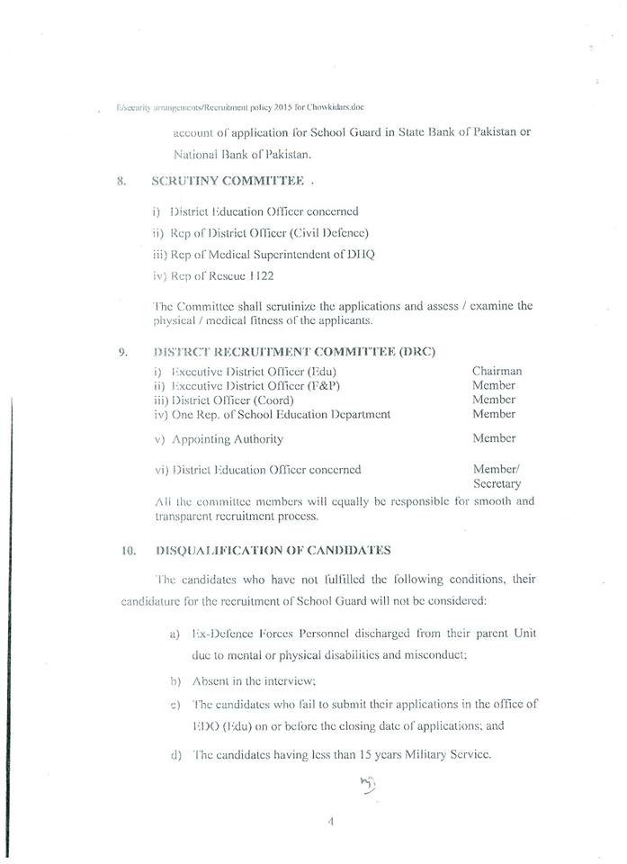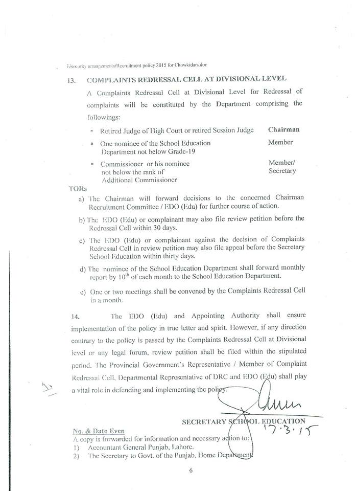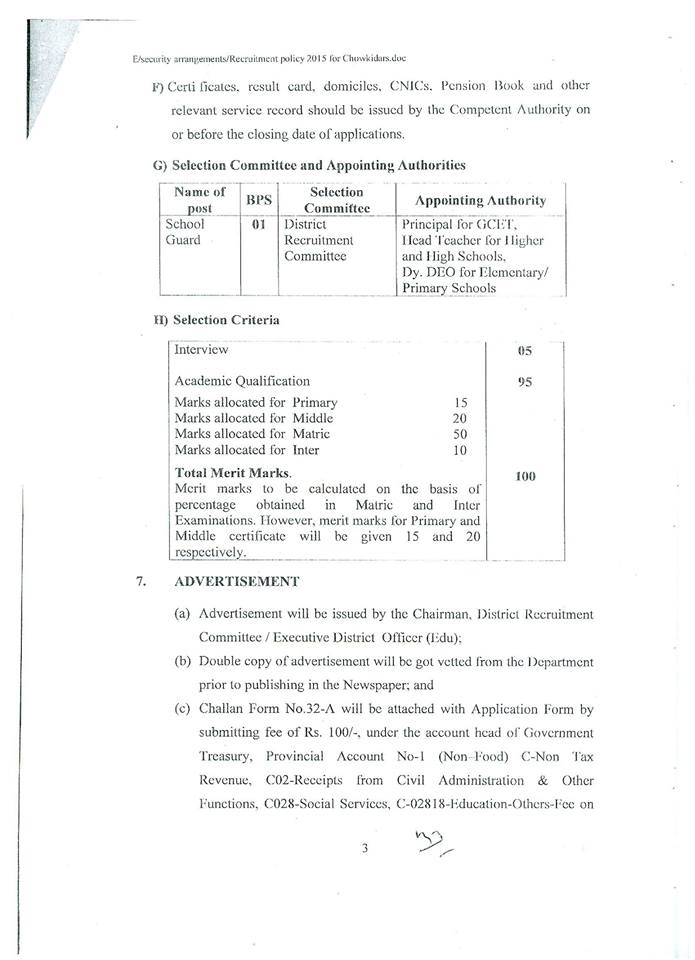 In continuation of the School Education Department’s Policy letter of even number dated 17th March 2015, the Chairman Distinct Recruitment Committee/Executive District Officers (Edu) are requested to furnish double copy of advertisement for recruitment of School Guards under Recruitment Policy 2015 for vetting from the Department prior to publishing in daily newspapers.