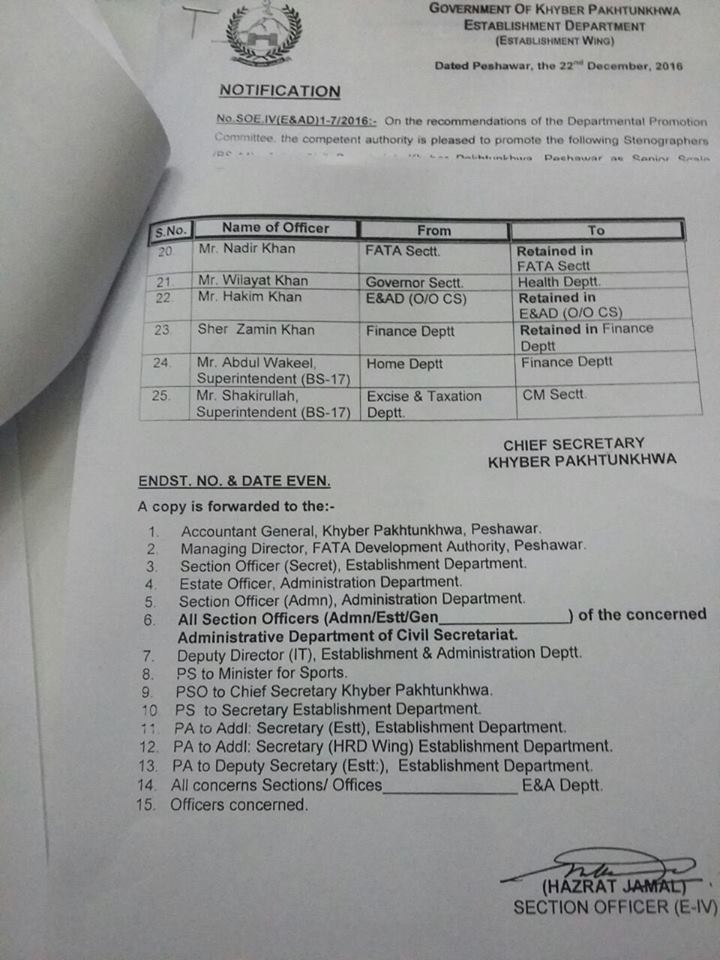 Government of KPK, Establishment Department (Establishment Wing) has issued Notification on 22-12-2016 in connection with Promotion of Senior Clerks & Assistants of Civil Secretariat KPK.