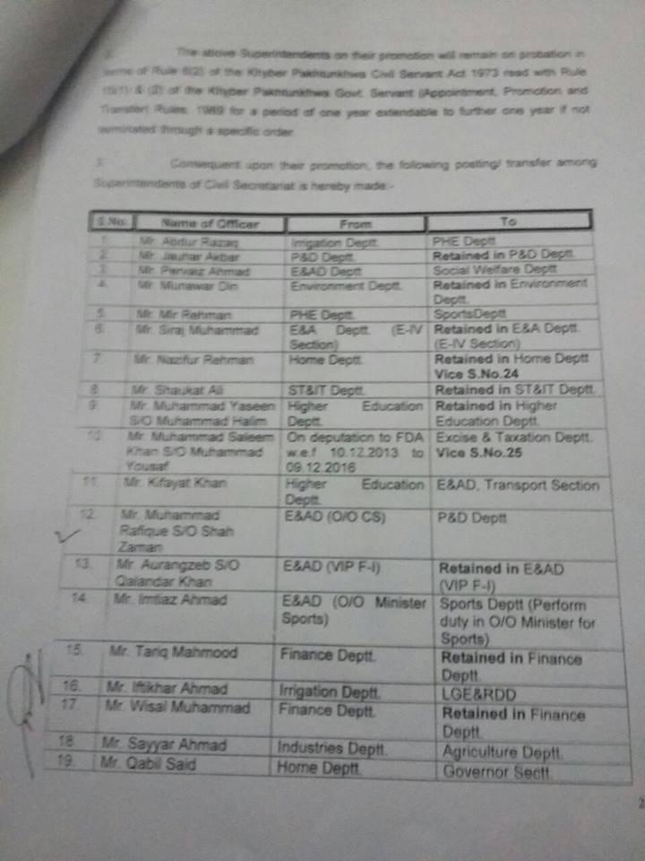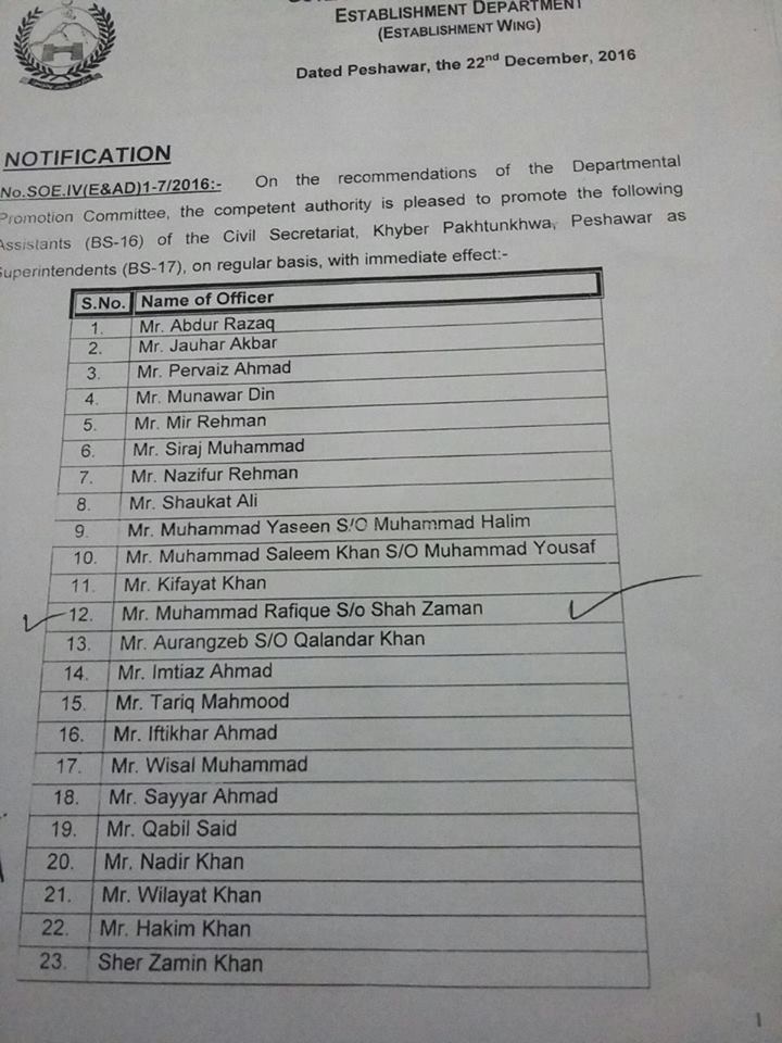 According to this Notification, Senior Clerks (BPS-14) have been promoted to BPS-16 as Assistants and Assistants BPS-16 has been promoted to Superintendents (BPS-17) with immediate effect. Special thanks to Mr. Arsalan Ahmad for sending the copy of the Notification of Promotion of Senior Clerks & Assistants of Civil Secretariat KPK.