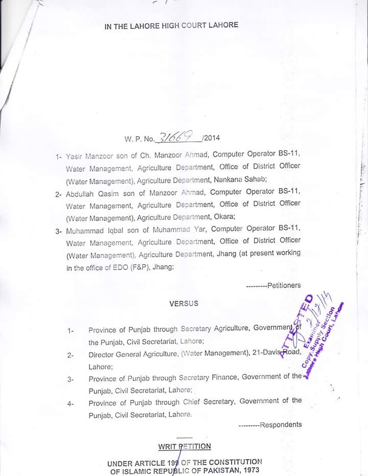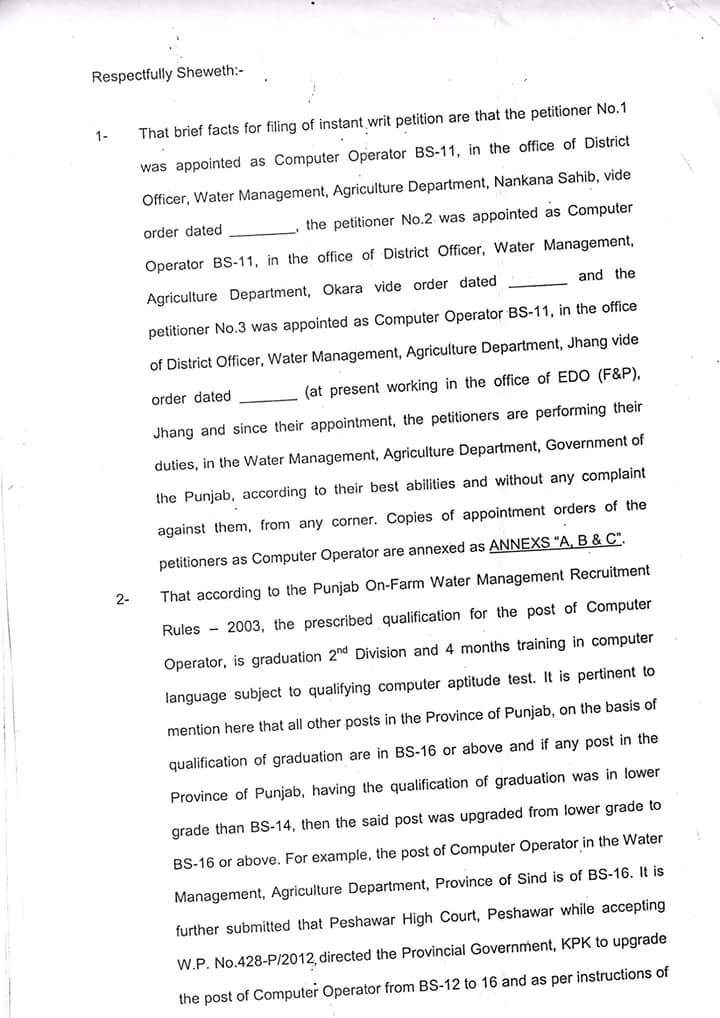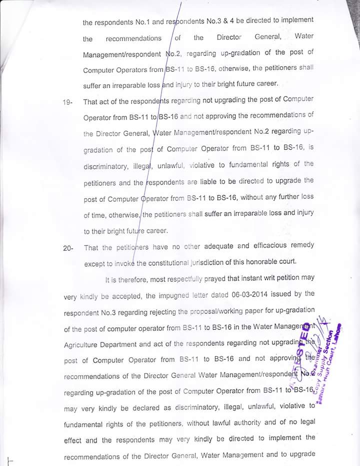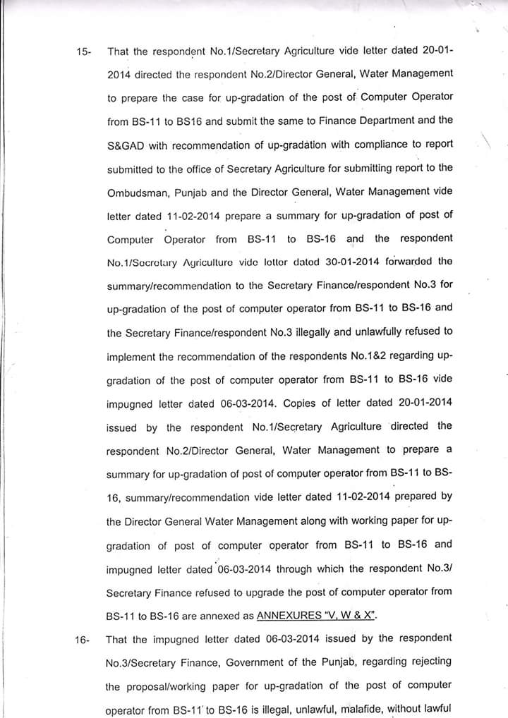 Order Sheet in connection with Up-gradation Computer Operators BPS-11 to BPS-16 has been issued on 14-01-2016 by the Lahore High Court, Lahore.