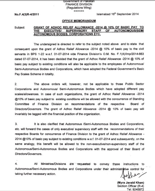 Notification Grant Adhoc Relief Allowance (ARA) 2025 @ 10% of Basic Pay (Federal)