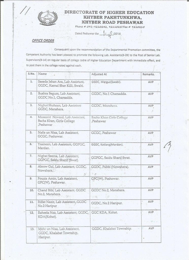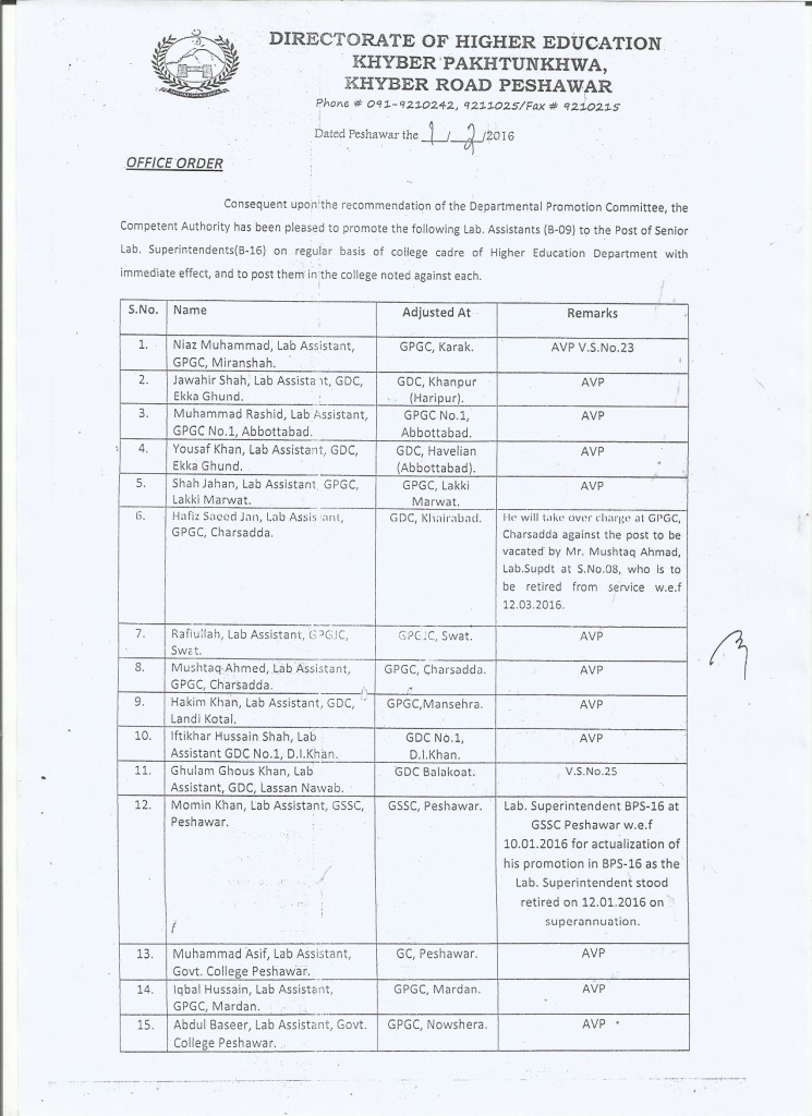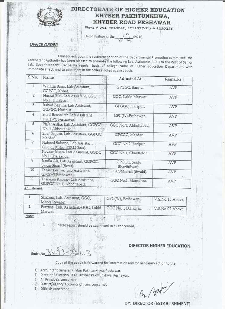 Directorate of Higher Education, Khyber Pakhtunkhwa has issued order on 01-02-2016 in connection with Promotion of Lab Assistants KPK Higher Education Department.
