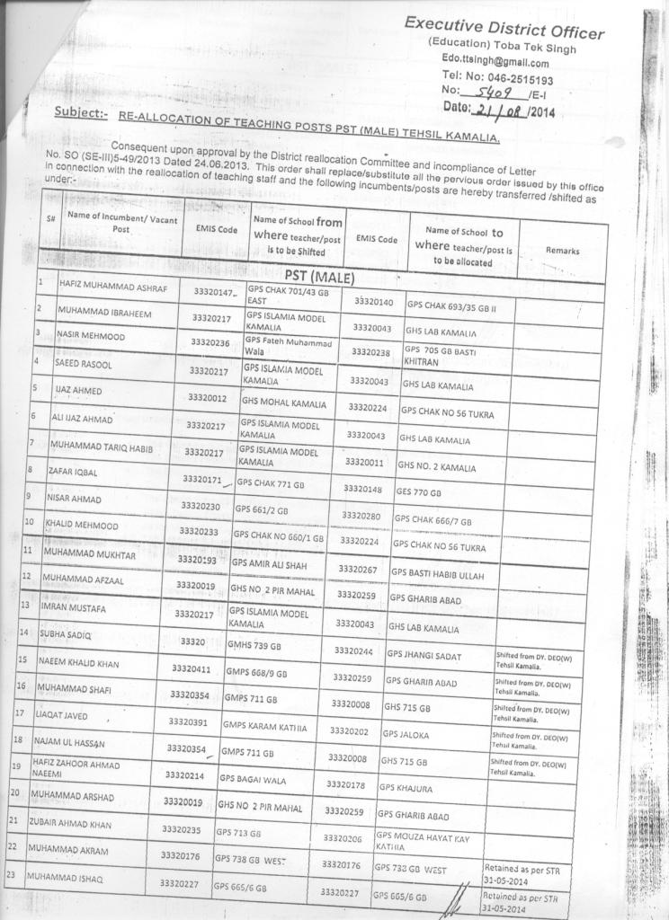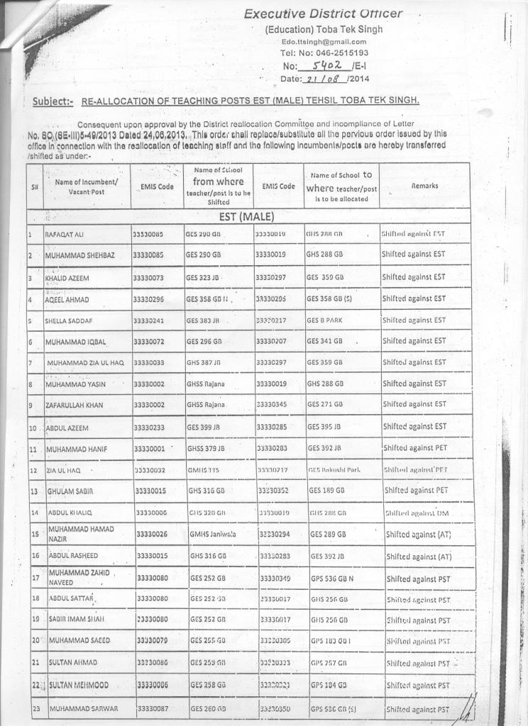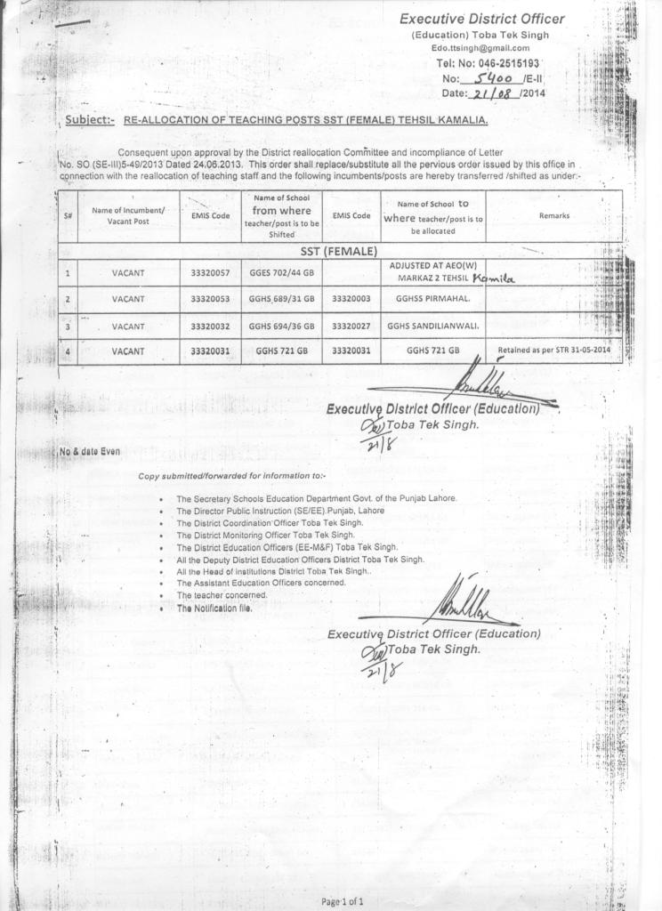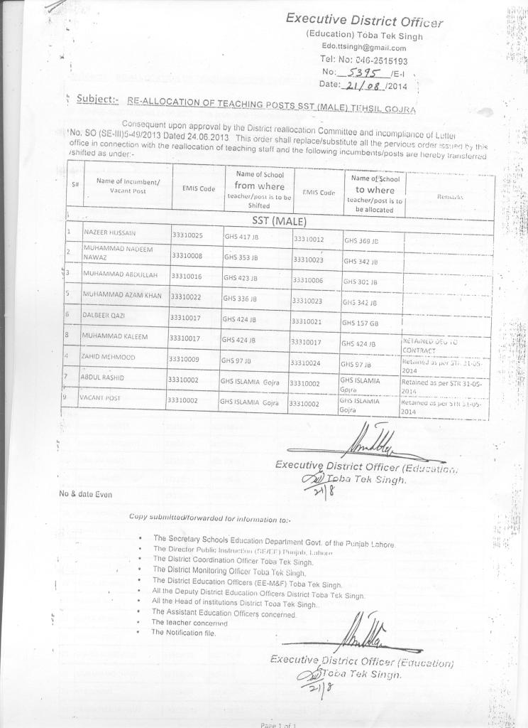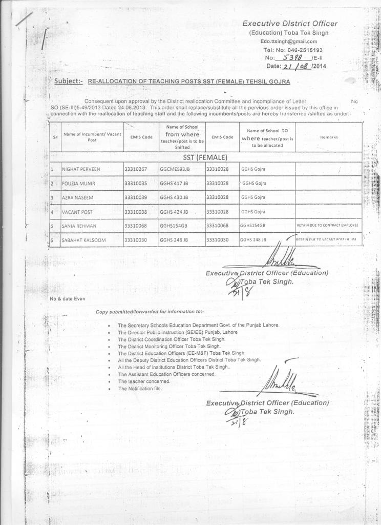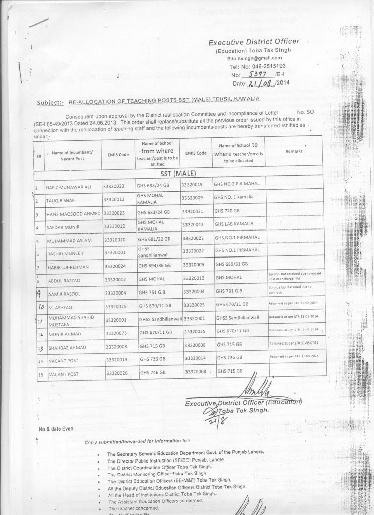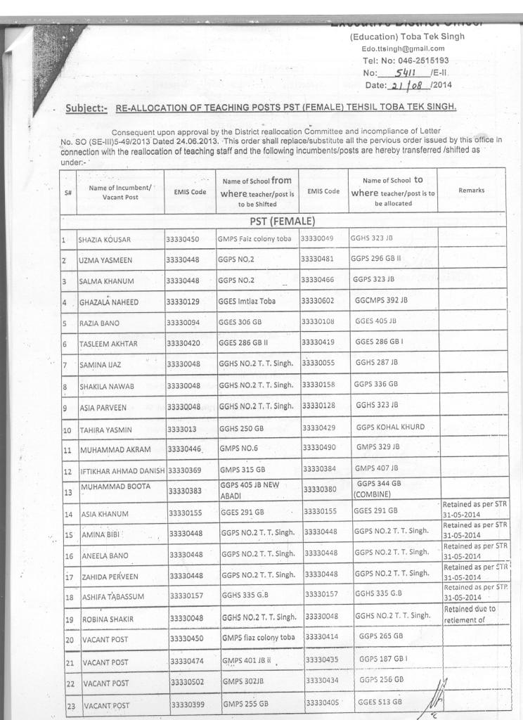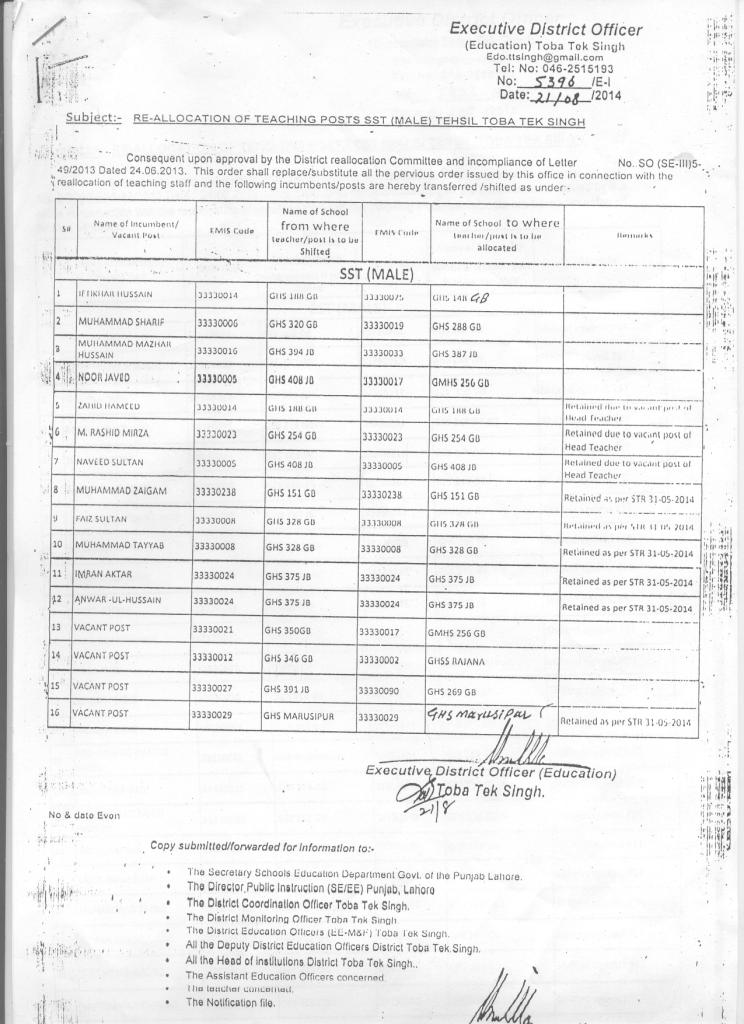 The Executive District Officer (Education) District Toba Tek Singh has issued various letters on 21st August 2014 for the Recent Re-Allocation of Teaching Posts in T.T Singh. These orders will replace/substitute all the previous orders issued. The detail of the same is as under: