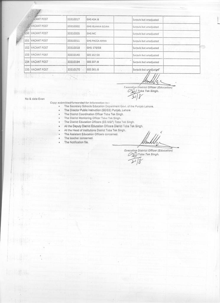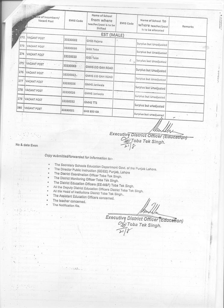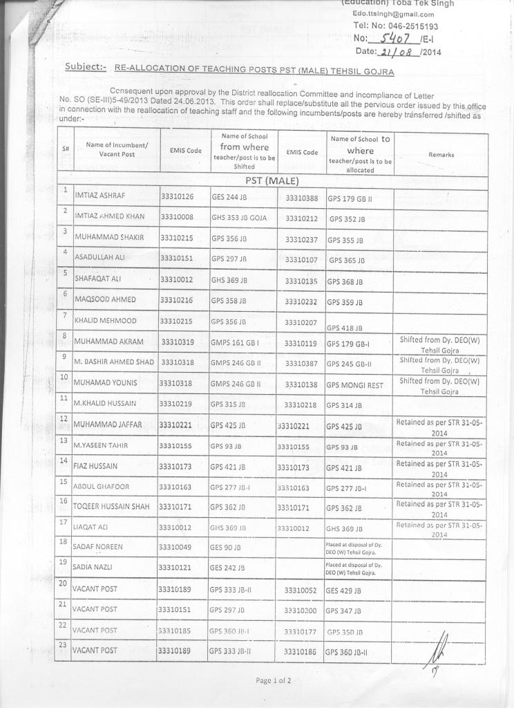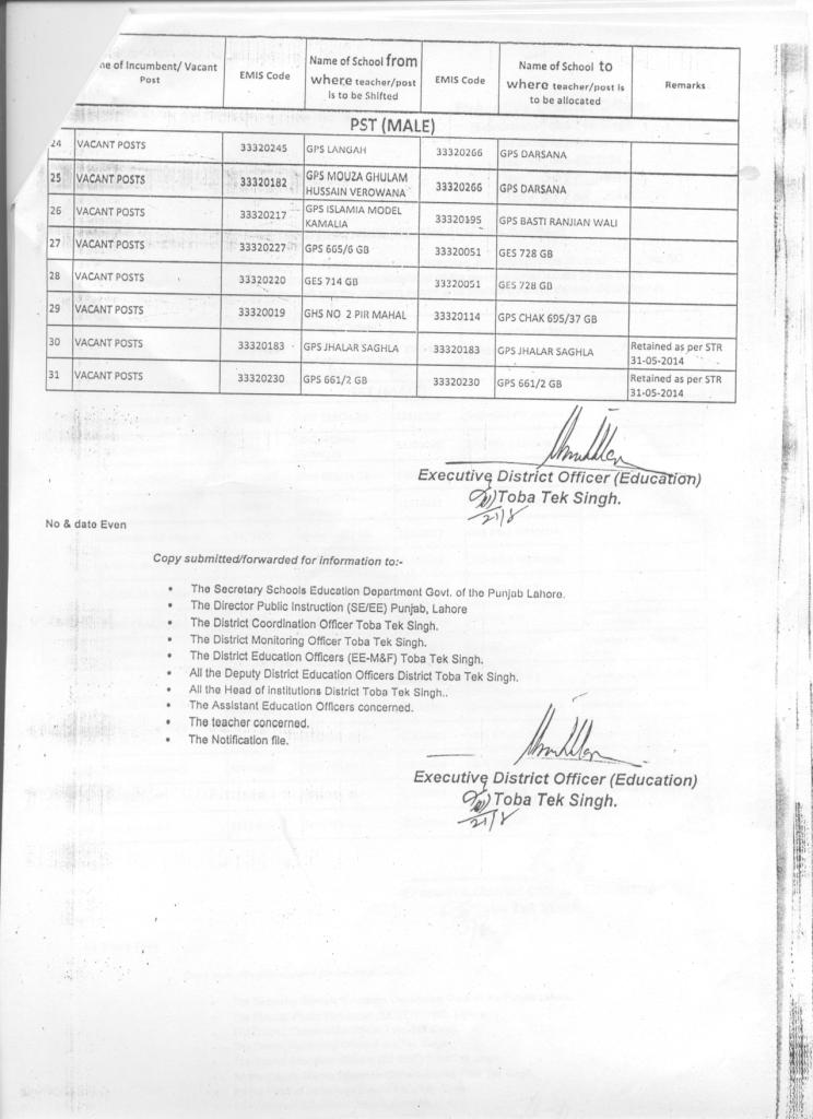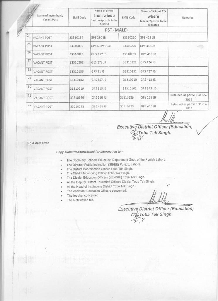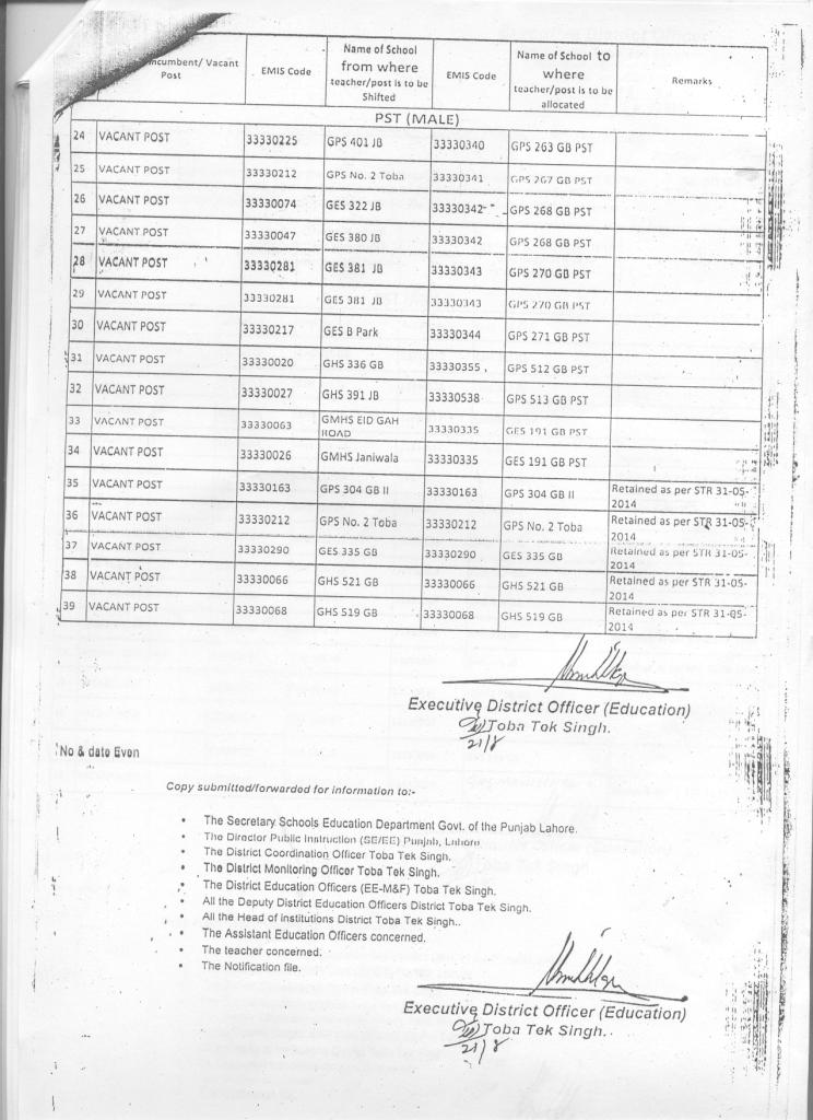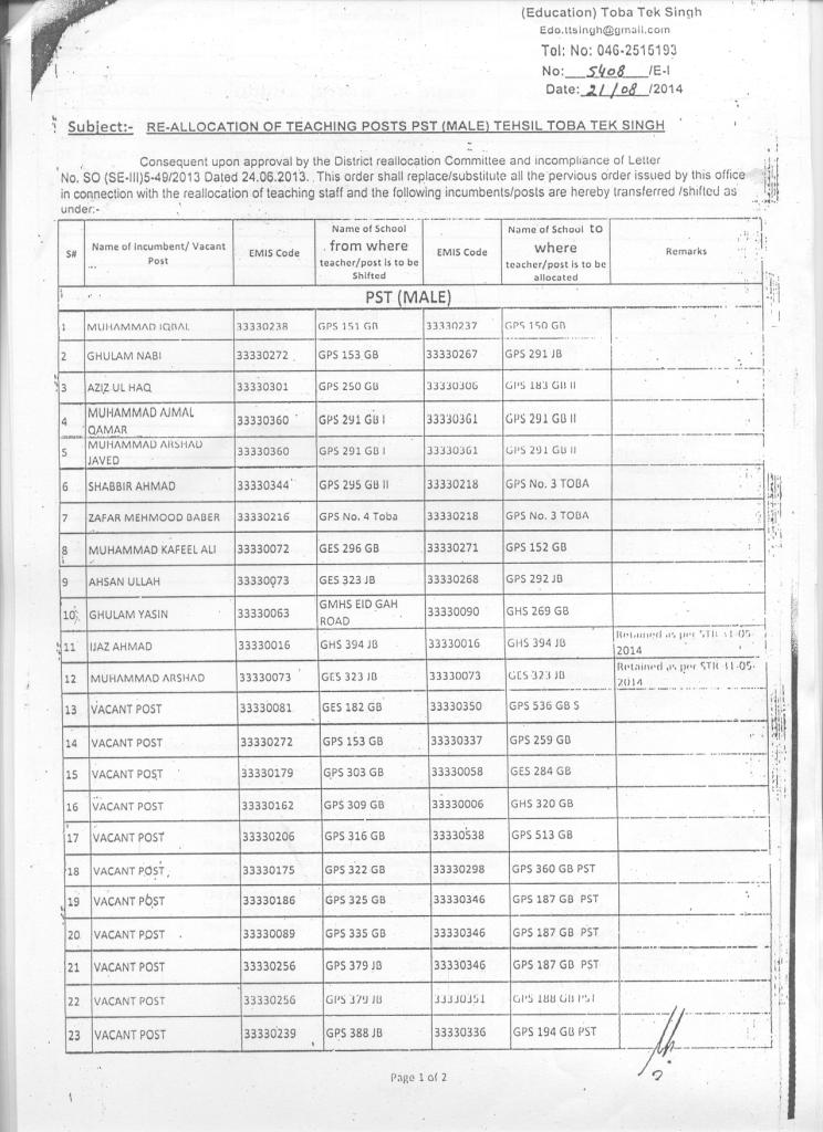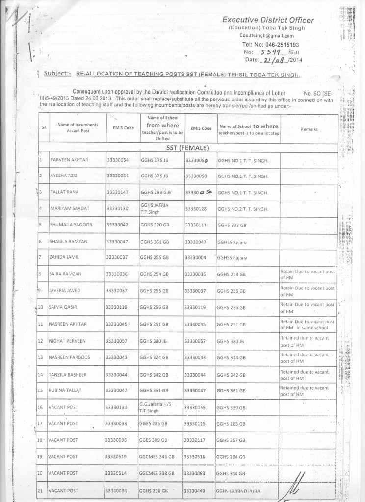 The Executive District Officer (Education) District Toba Tek Singh has issued various letters on 21st August 2014 for the Recent Re-Allocation of Teaching Posts in T.T Singh. These orders will replace/substitute all the previous orders issued. The detail of the same is as under: