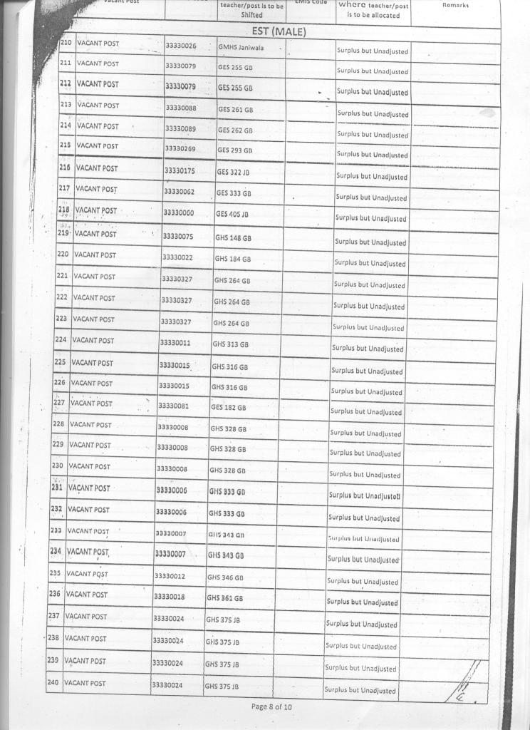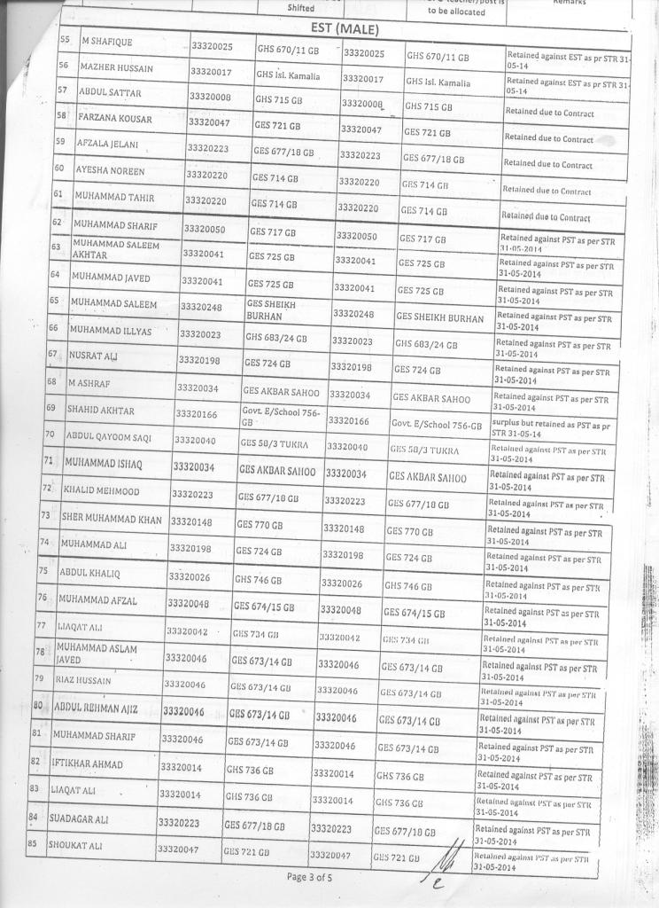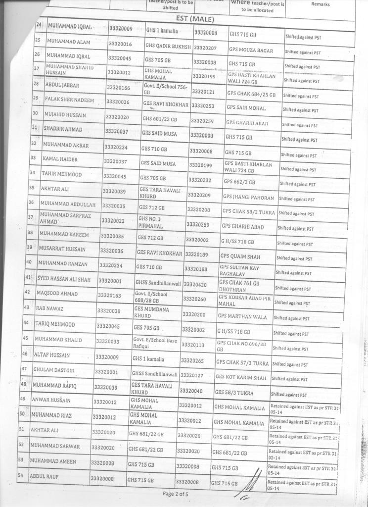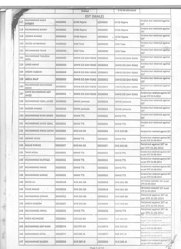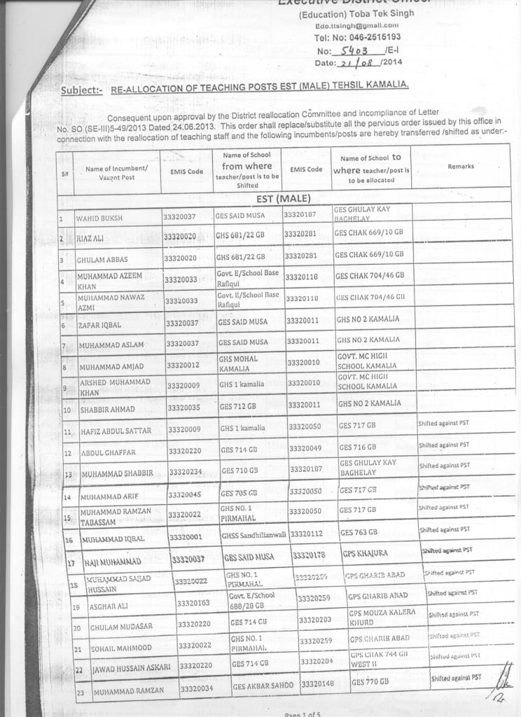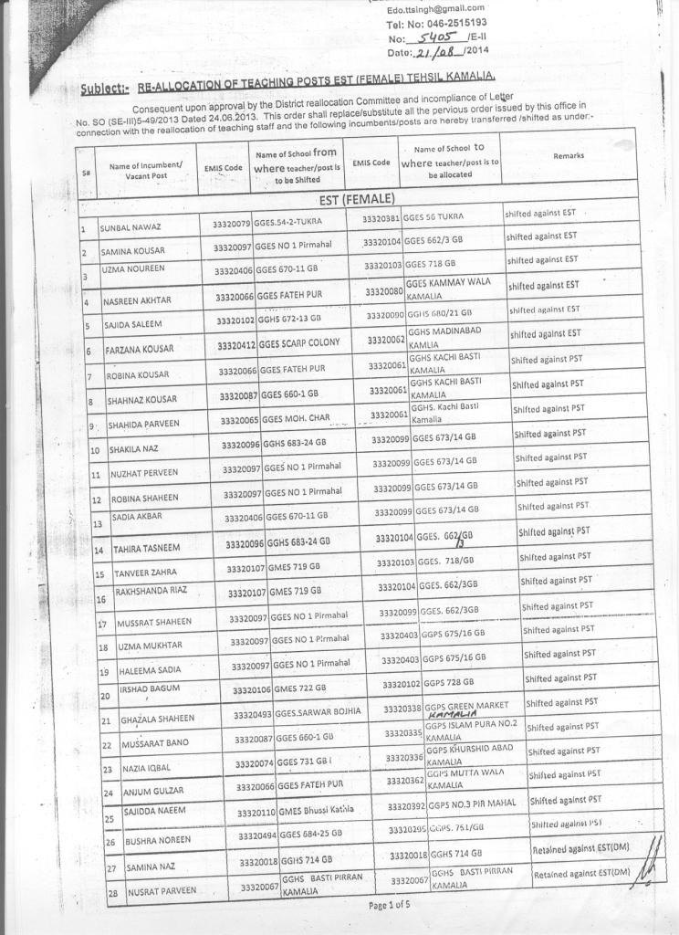 In Tehsil Kamalia re-allocation of the following teaching staff has been made.