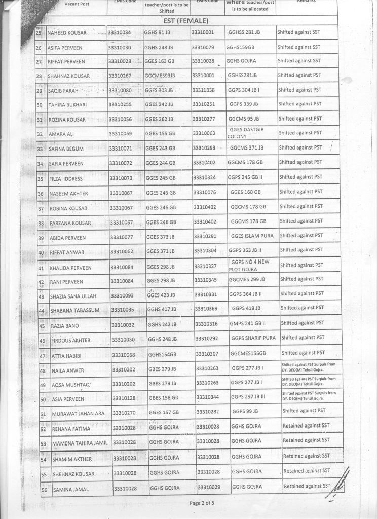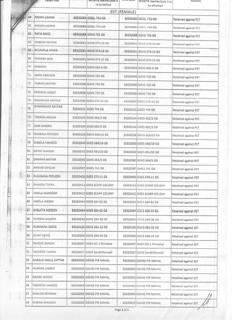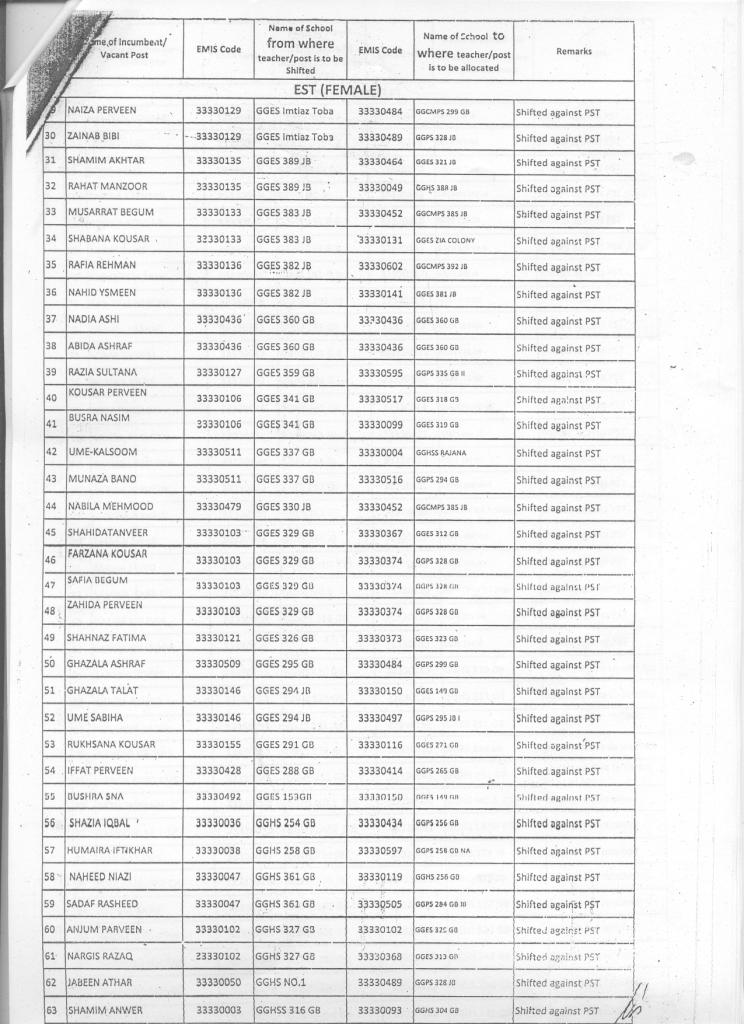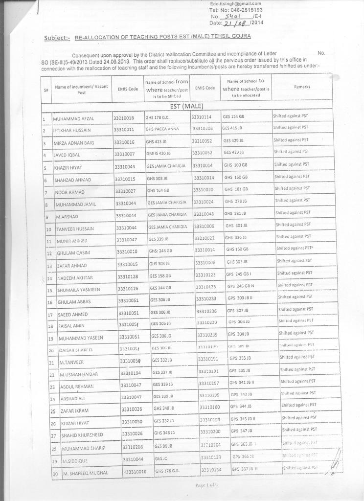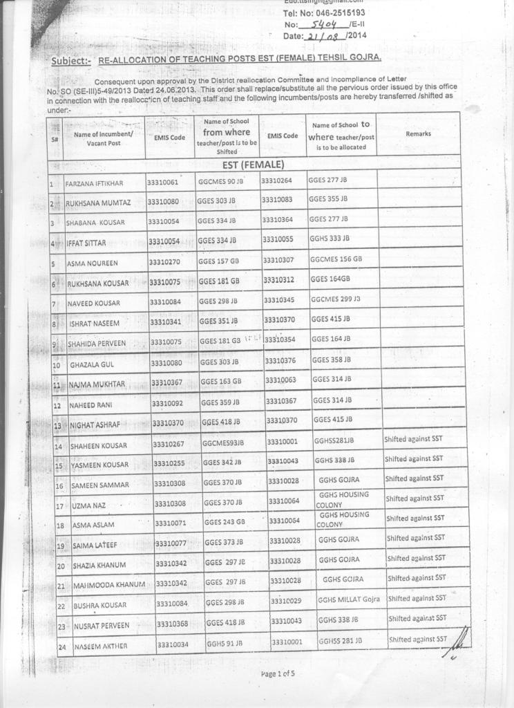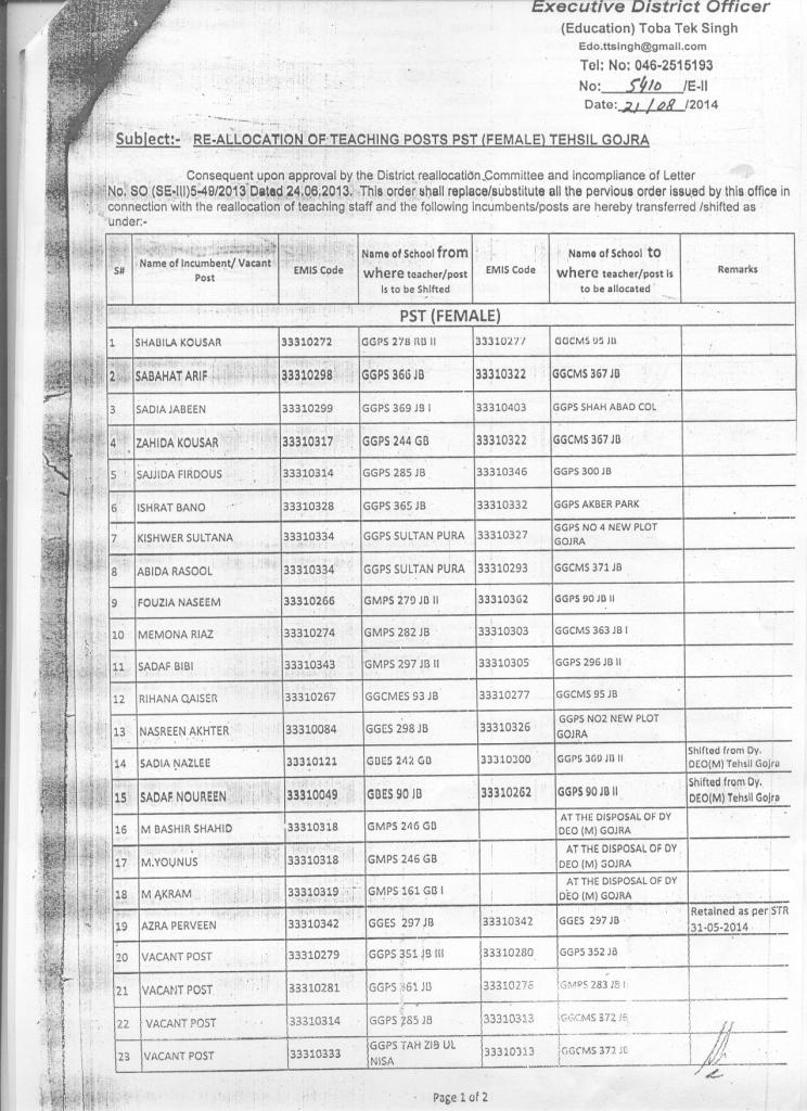 In Tehsil Gojra re-allocation of the following teaching staff has been made.