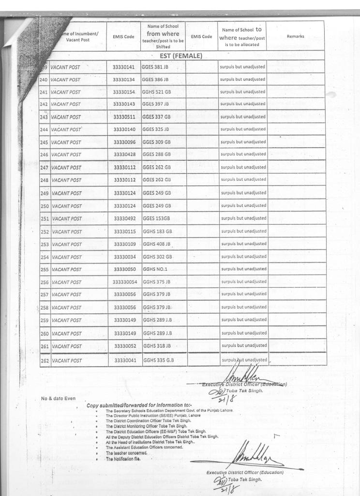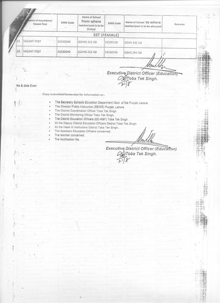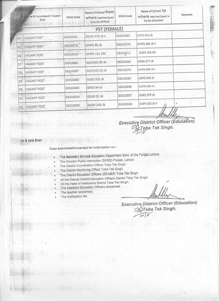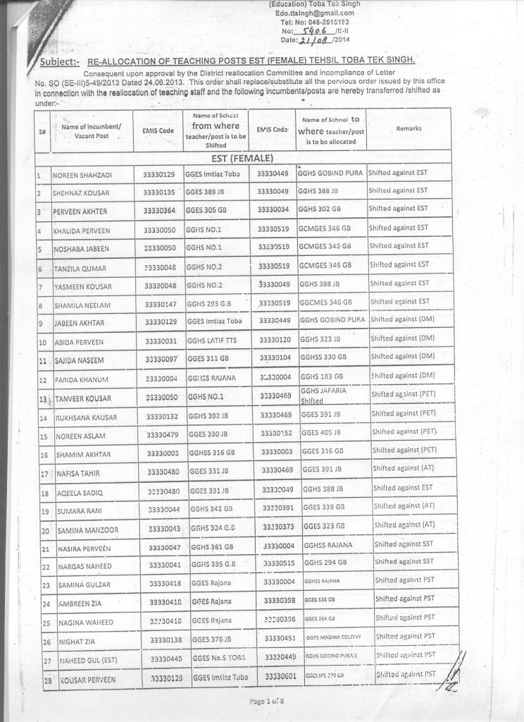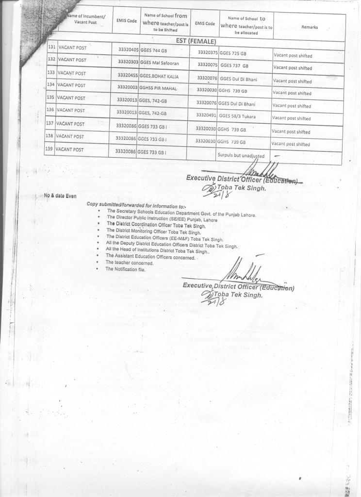 In Tehsil Toba Tek Singh re-allocation of the following teaching staff has been made.