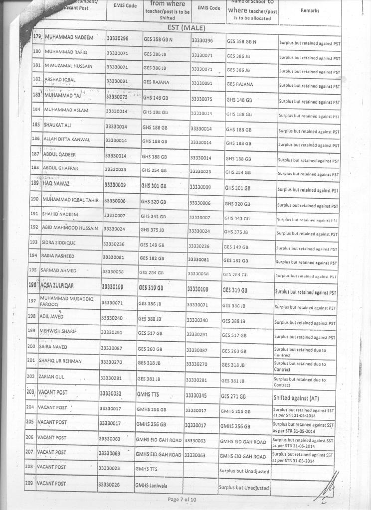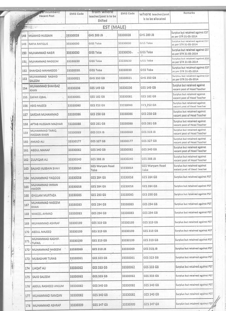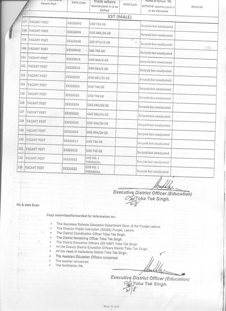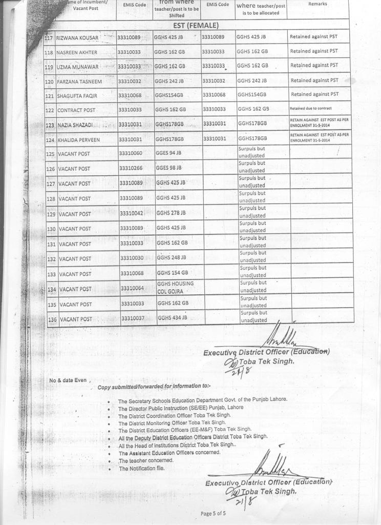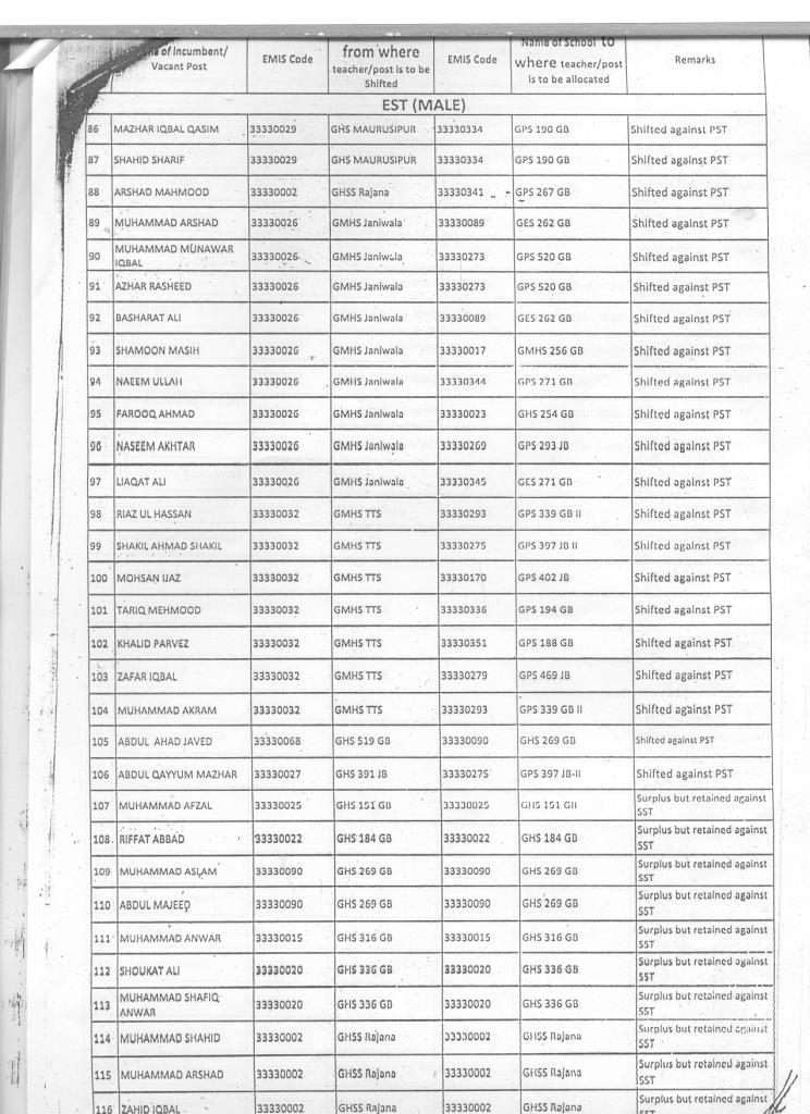 In Tehsil Toba Tek Singh re-allocation of the following teaching staff has been made.