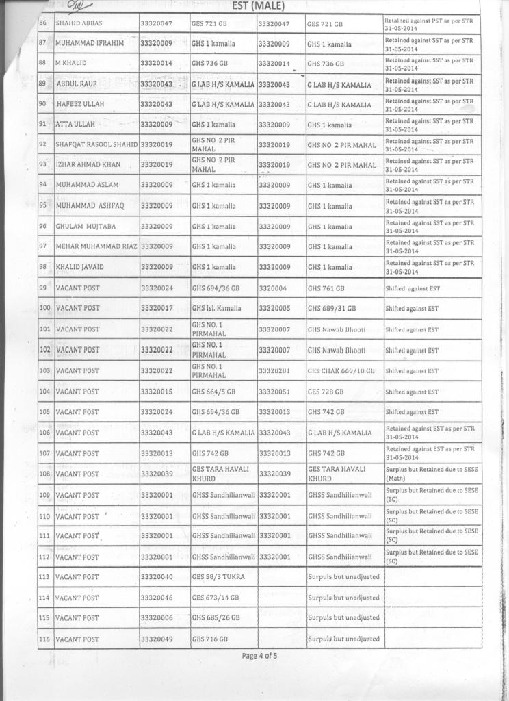 - Elementary School Teachers (EST) Male Tehsil Gojra vide No. 5401/E-I dated 21-08-2014