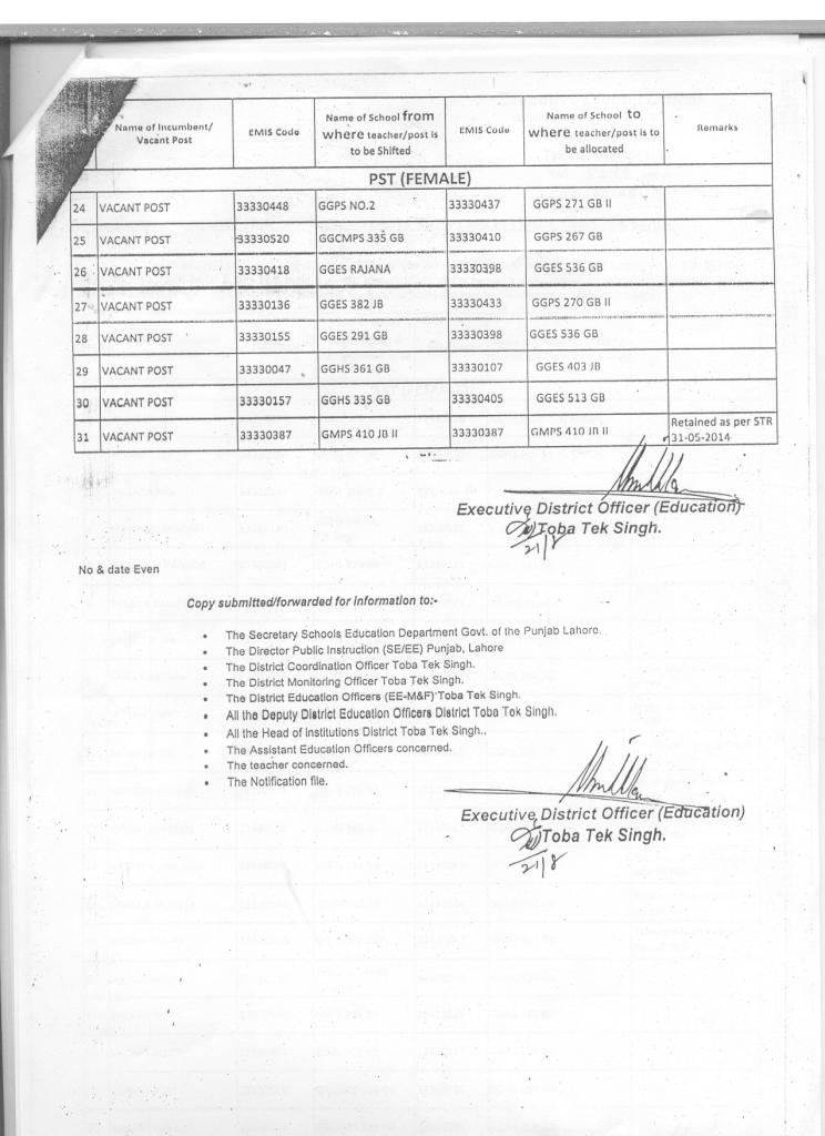 - Primary School Teachers (PST) Female Tehsil Toba Tek Singh vide No. 5411/E-I dated 21-08-2014