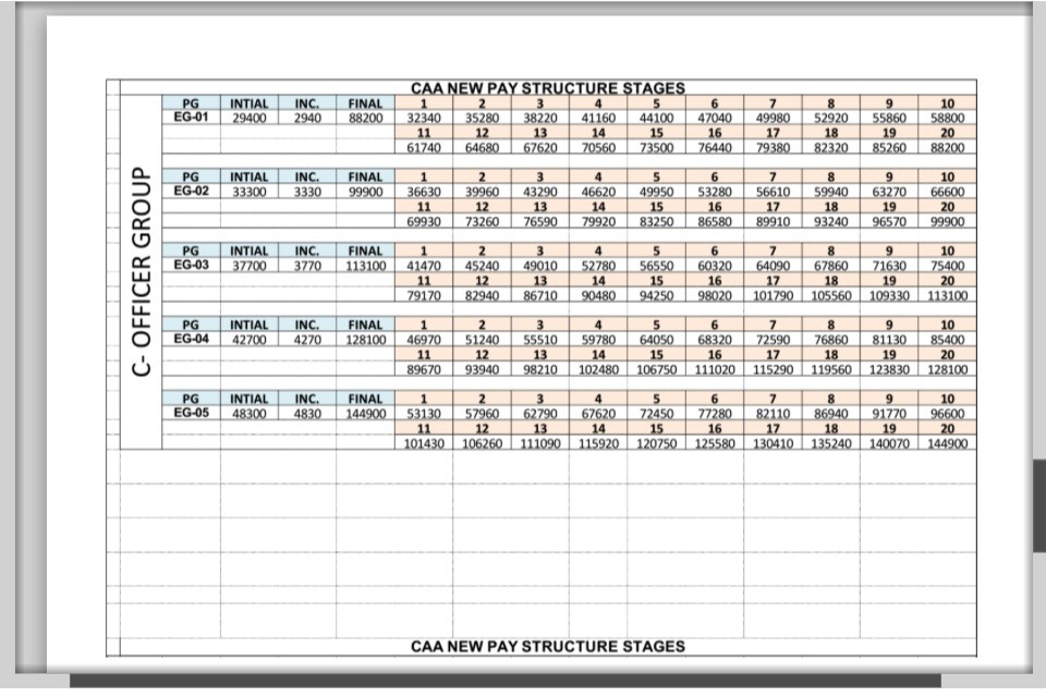 New Pay Scales-2014 as given in First Schedule of CAA Employees Pay, Pension and Travelling & Daily Allowance has been shown on the copy of the Notification.